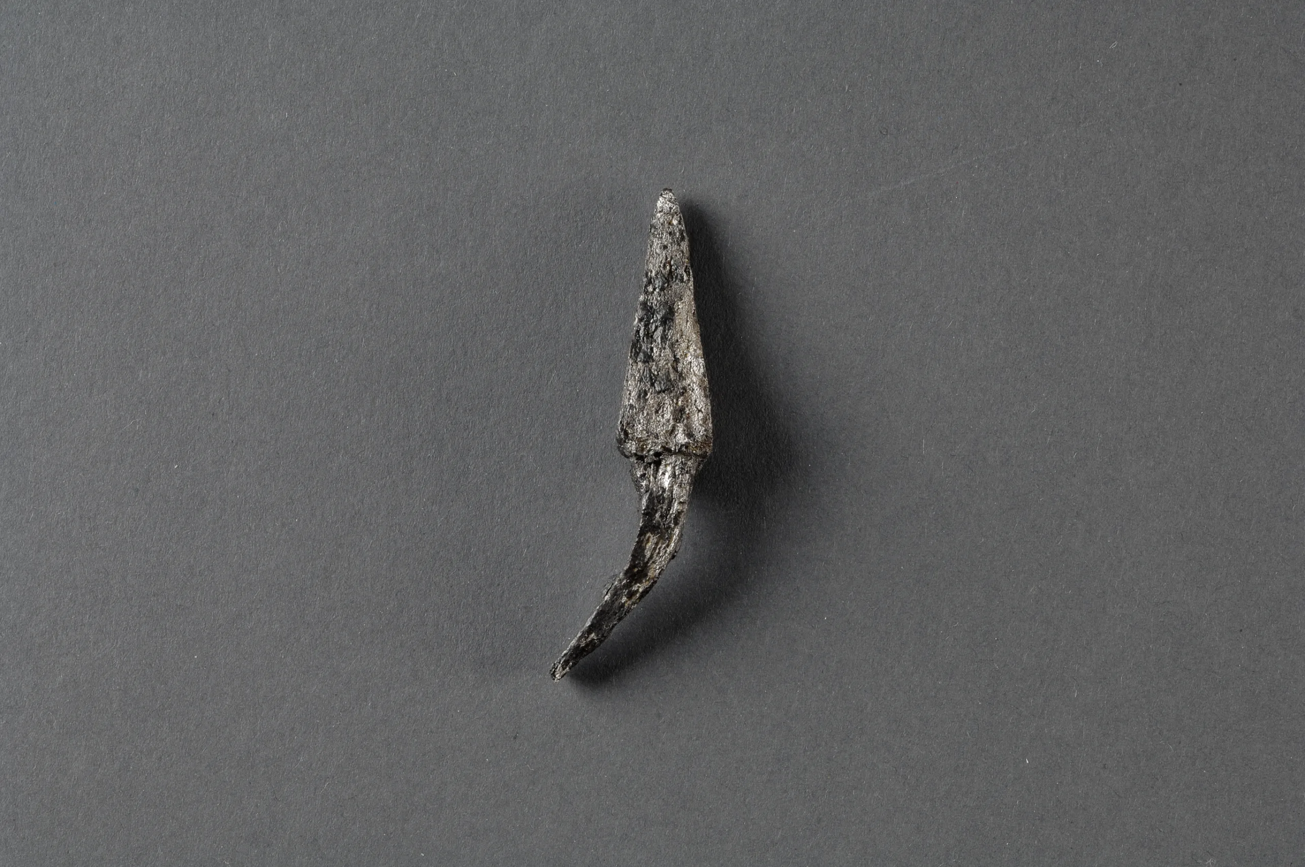 From the mass graves, the Cross Meadow, Visby parish, Gotland, 1250-1361 A.D. In the mass graves two long spikes and four smaller spikes were found. These have become detached from the weapon and remained in the dead bodies. The smaller spikes were probably attached to maces. The longer spikes were placed at the top of the mace. The smaller spikes were spread out over the head of the mace. SHM 19325:Tss22