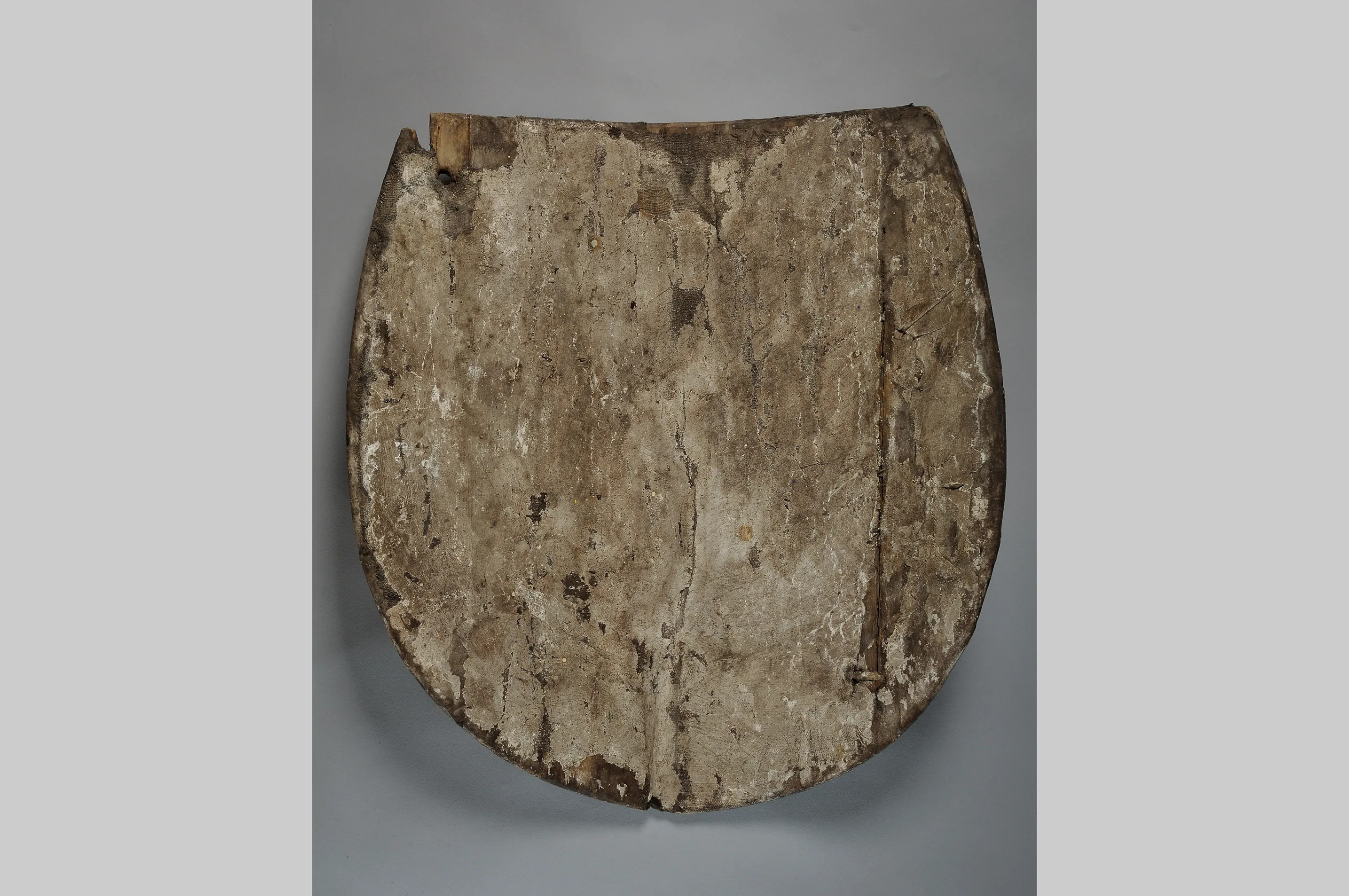 From Döderhult parish, Småland, 14th century. This shield has been stored for a long time in the tower room at the church in Kristdala. The shield belonged to either Lyder or Henrik Svinakula, who owned farms in the area in the 14th century. The shield has been used as a memorial coat of arms, but the construction corresponds with battle shields for this period. The shield is built with a wooden foundation. The foundation is constructed with several vertically composed wooden boards. The foundation is covered with a coarse linen fabric that has been treated with a chalk finish.