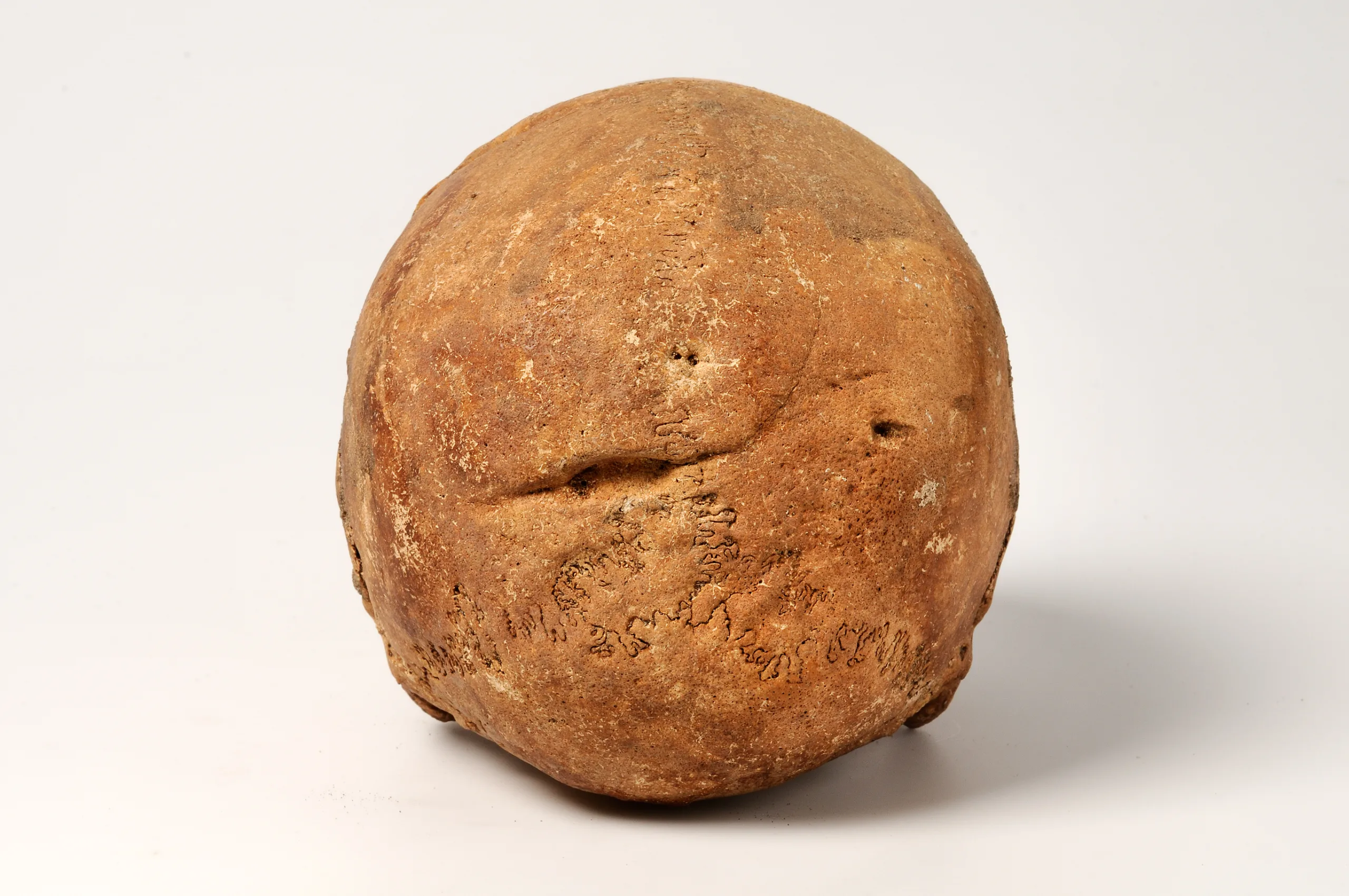 Male, 25-35 years, strontium analysis reveals that he has grown up on Gotland. At the back of the skull on the left side, and on the crown close to the frontal bone, two elongated depressions are visible; signs of healed wounds. Small, unhealed punctures are visible on the right side of the skull. Top shelf. SHM 18872:B