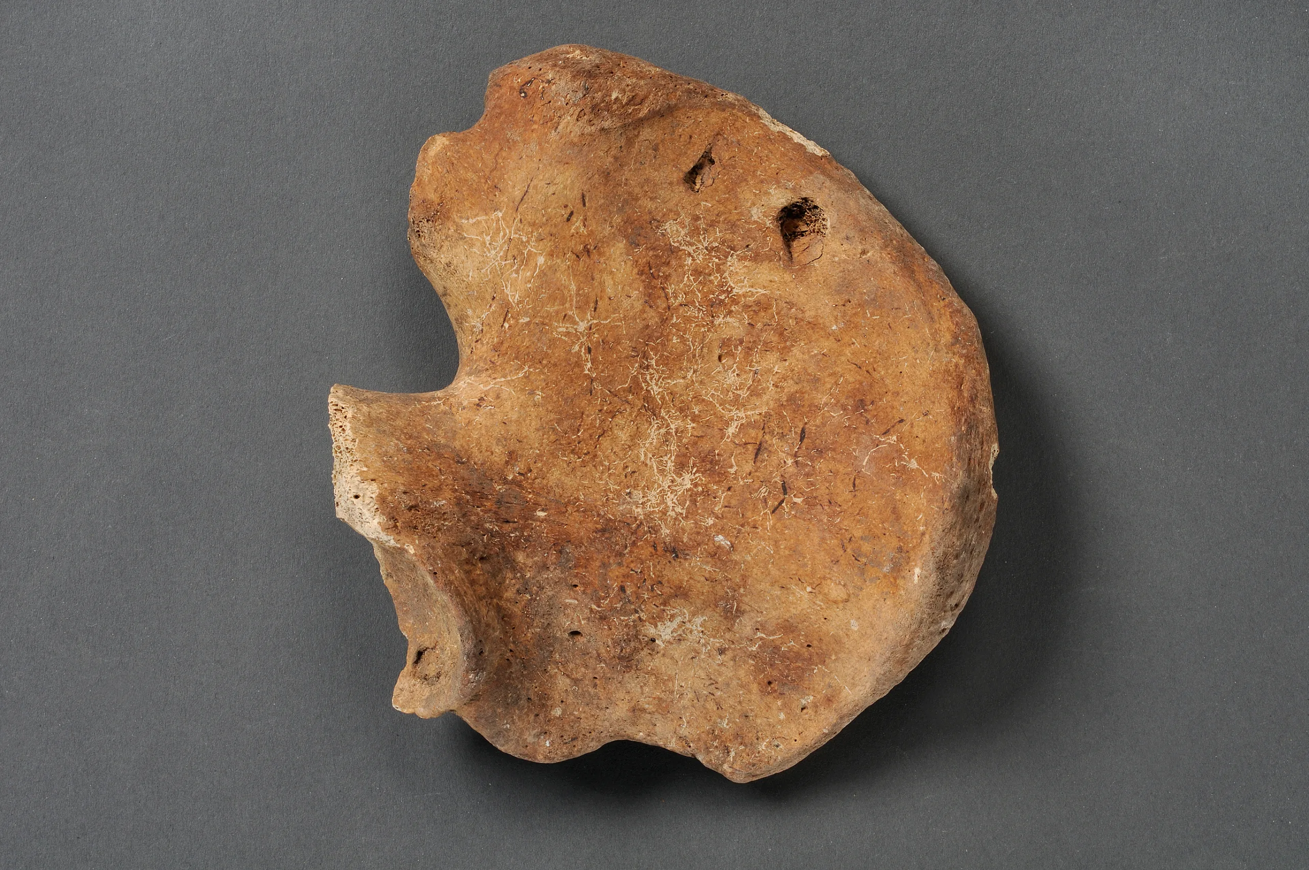 Bildtext Bäckenben Från en vuxen man. Två stickmärken. Monterns motsatta sida, andra hyllan uppifrån. SHM 17530:D