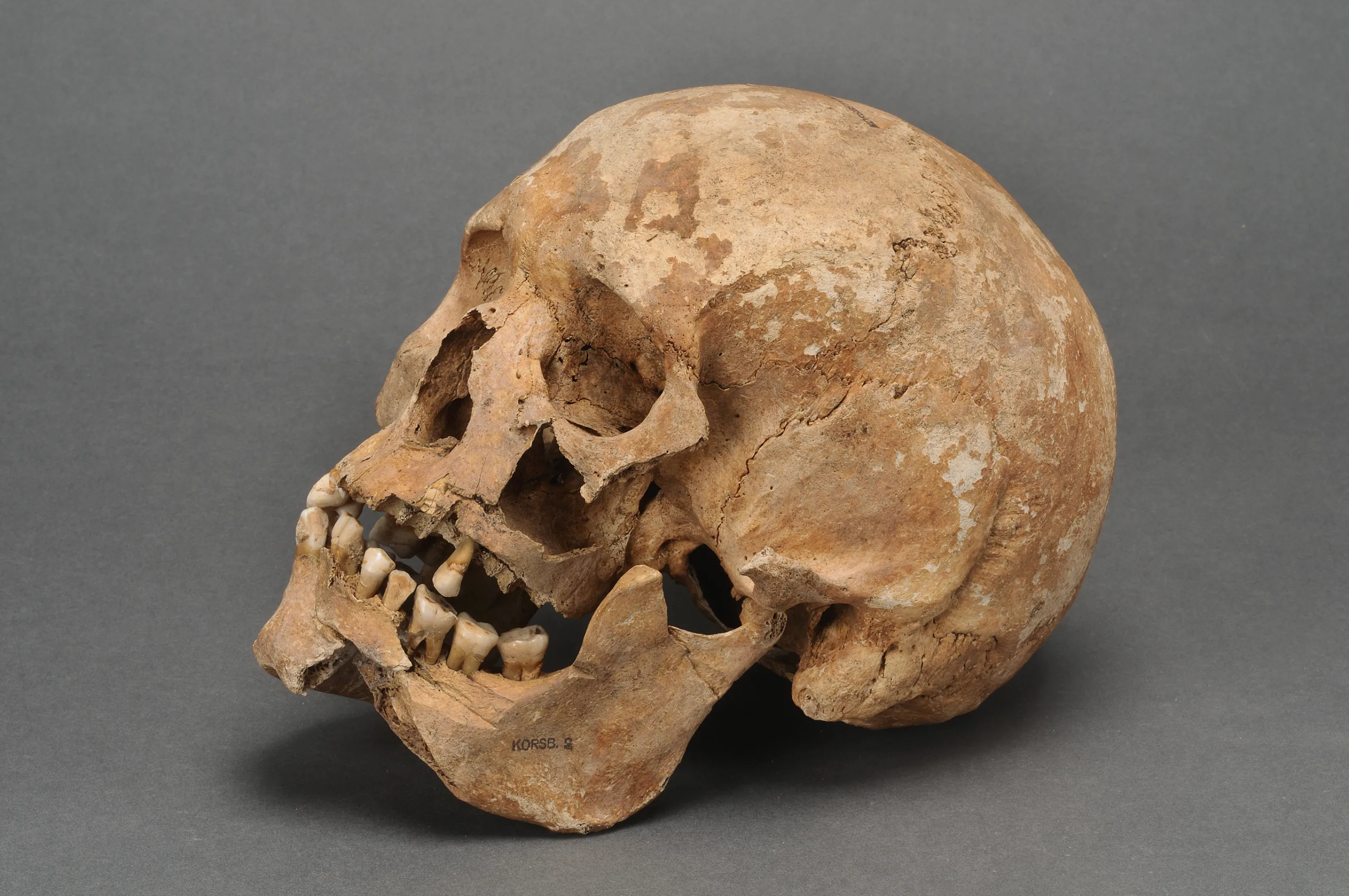 Caption Skull From a 20-25 year-old individual. A couple of powerful blows to the upper and lower left jaw. Opposite side of the display, second shelf from the top. SHM 19525
