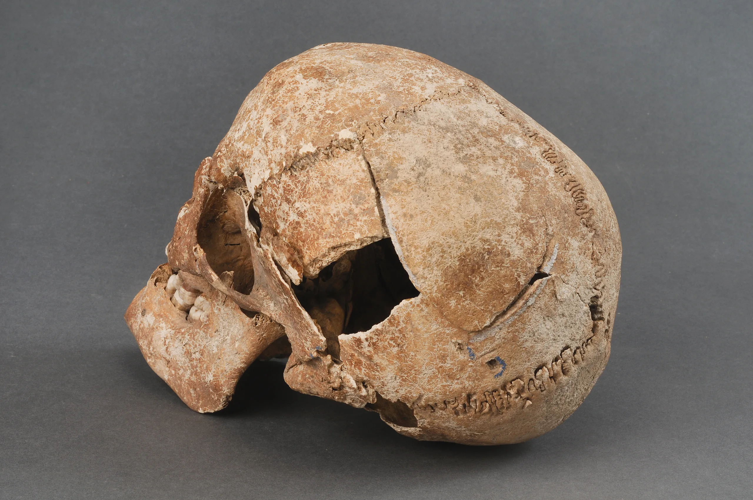 Bildtext Kranium med underkäke Från en ung individ under 20 år. Visdomständerna är på väg upp. I bakhuvudet syns märken efter svärdshugg samt pilhål. Monterns motsatta sida, tredje hyllan nedifrån. SHM 17530:B