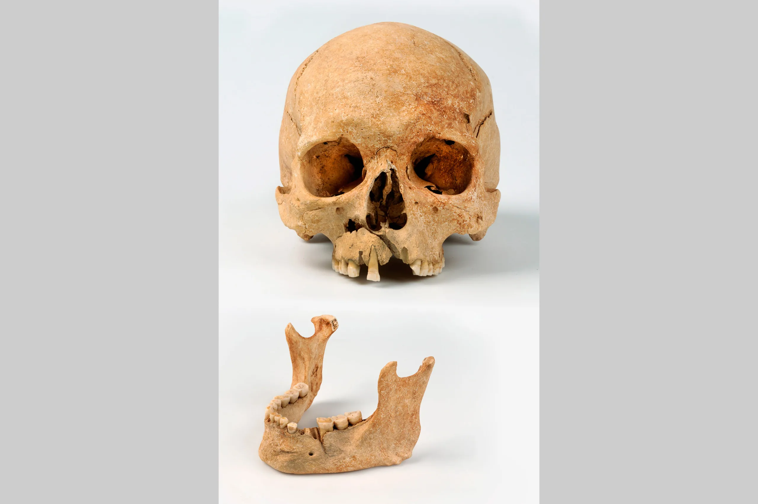 Från en man 25-35 år. Den preliminära strontiumanalysen tyder på att han har vuxit på Gotland. Mannen har fått ett kraftigt hugg genom överkäke och underkäke samt ett ytligt hugg i bakhuvudet. Monterns motsatta sida, tredje hyllan nedifrån. SHM 35137