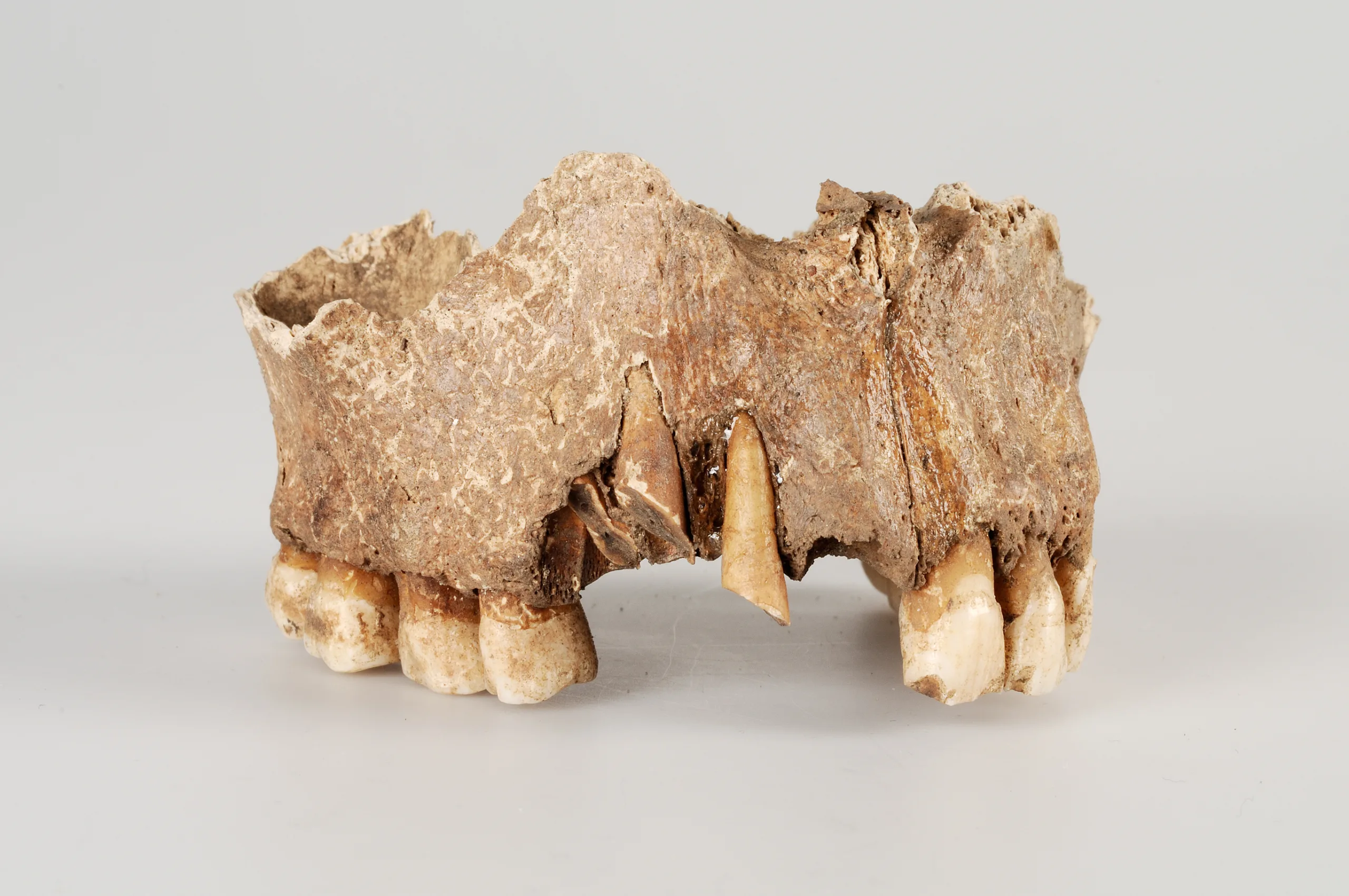 Caption Upper jaw Upper jawbone from a 25-30 year-old individual, with stab wound through the front tooth, canines and front molar on the right side. Opposite side of the display, third shelf from the bottom. SHM 17530
