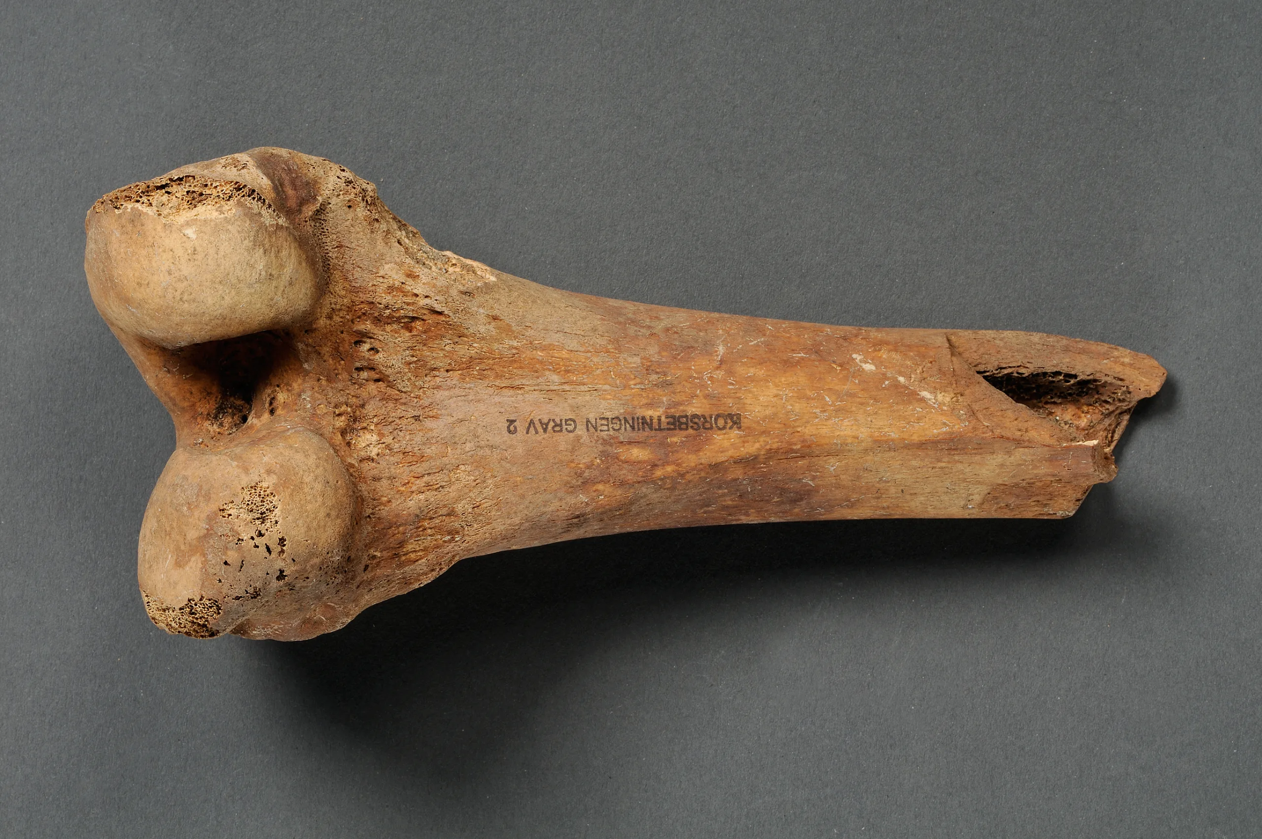 Caption Thigh bone, right From an adult individual. The lower part of the back of the skull has been subjected to a powerful blow. Opposite side of the display, third shelf from the bottom. SHM 18872:B