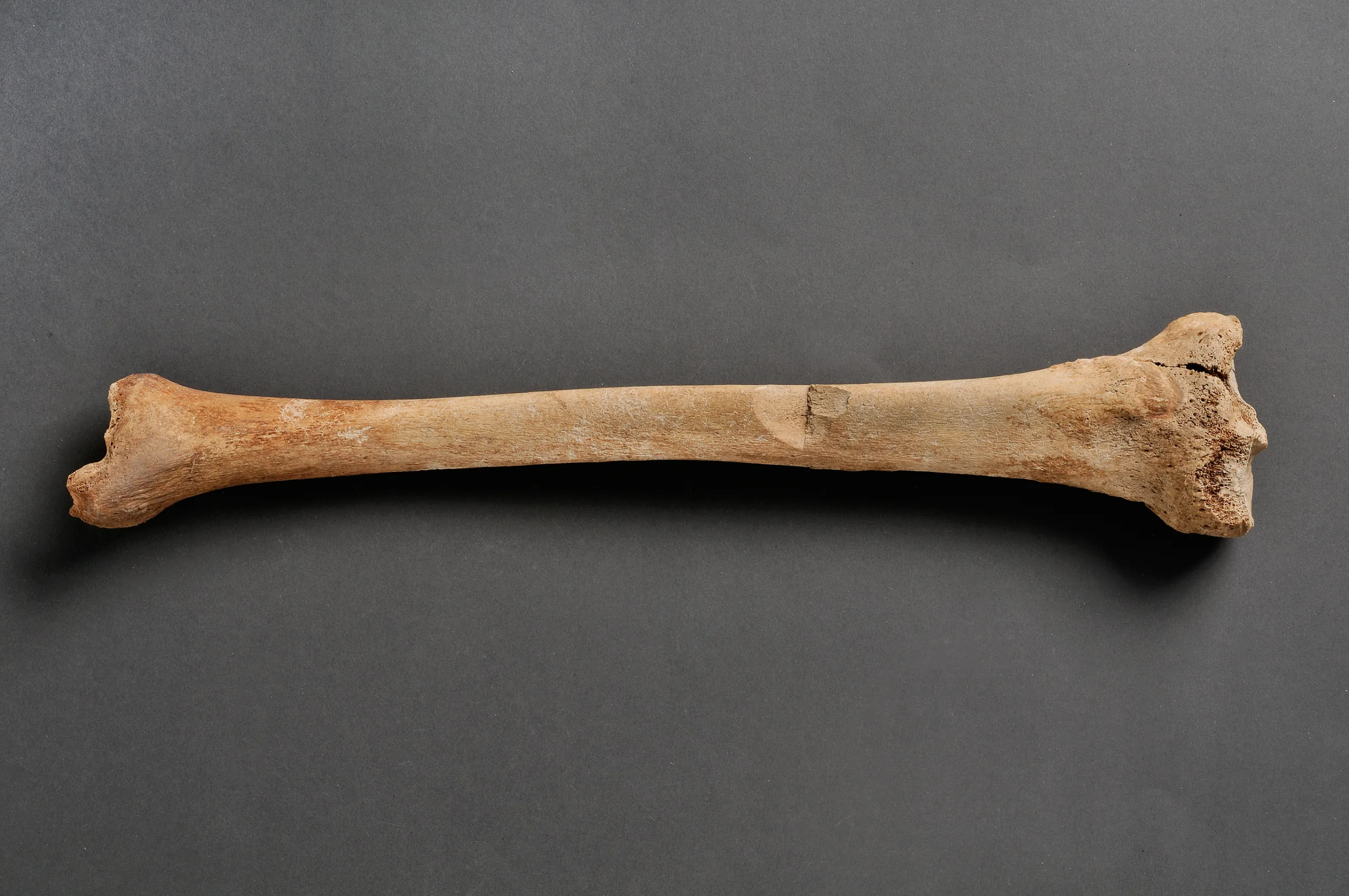 Caption Shinbone, right From an adult individual. The bone was struck with a powerful blow in the middle of the front, causing a fragment of bone measuring 4x1.5 cm to come away. Opposite side of the display, second shelf from the bottom. SHM 18872:A