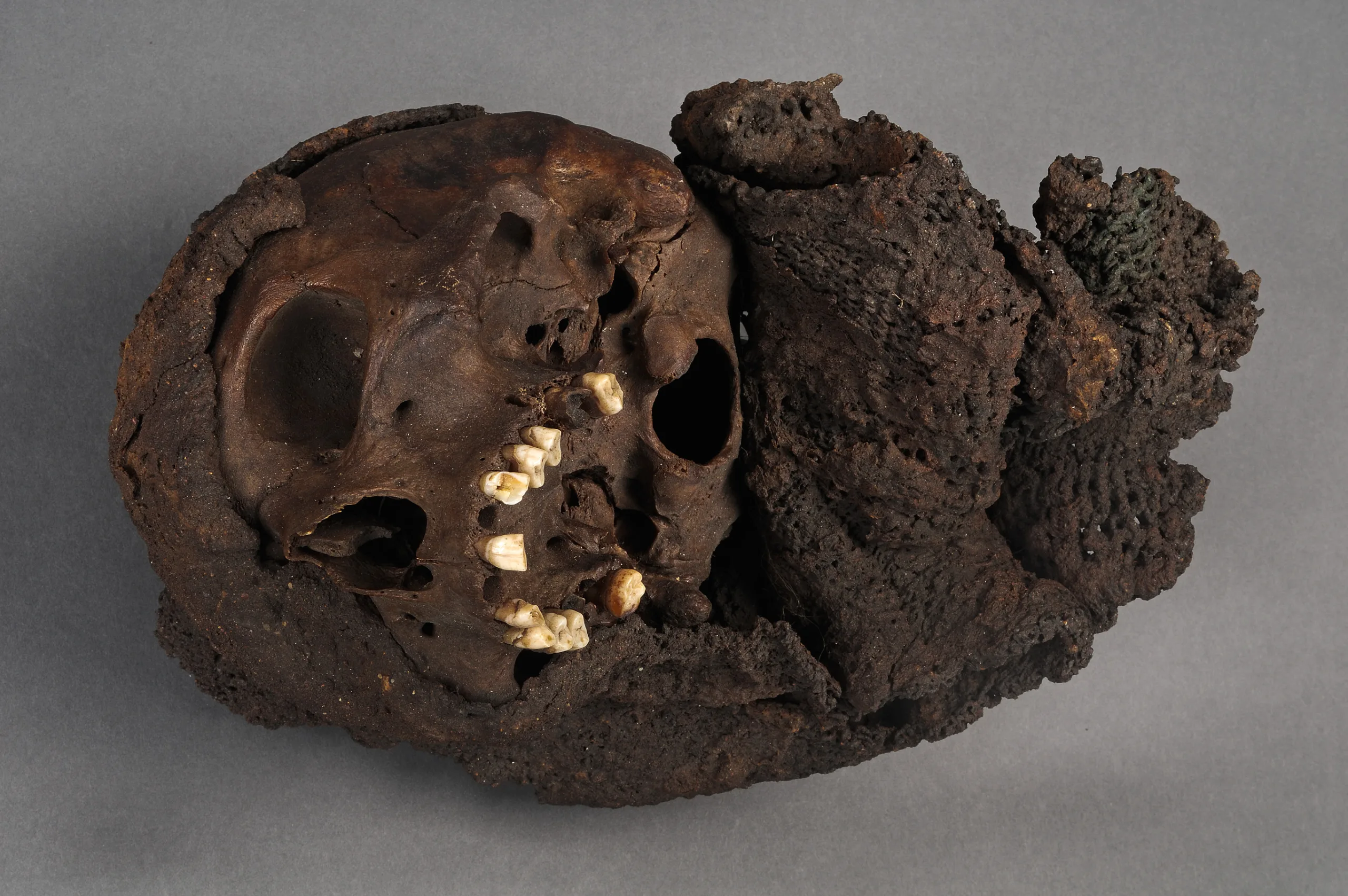 Från massgravarna, Korsbetningen, Visby socken, Gotland. Man, 20-25 år. Enligt en preliminär så kallad strontiumanalys är det svårt att avgöra om han har vuxit upp på Gotland eller i Danmark. Ingen tandkrona kvar på de två första bakre kindtänderna i överkäken, troligen på grund av kariesangrepp. SHM 19325, 19325:Oö4