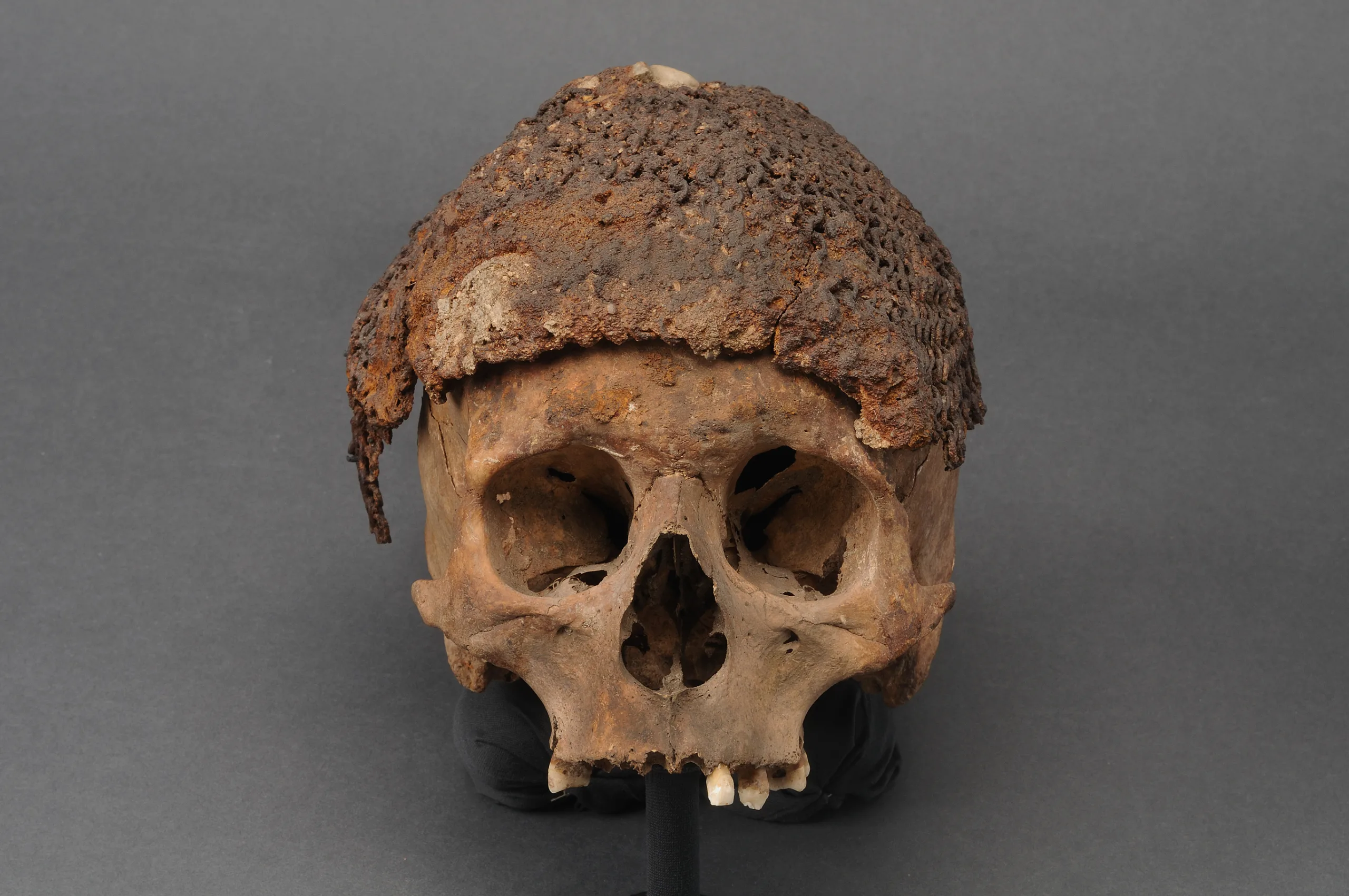 Caption Skull/Chain-mail hood, iron From the mass graves, the Cross Meadow, Visby parish, Gotland. Male, 20-25 years. SHM 17530B,17530:BII:546