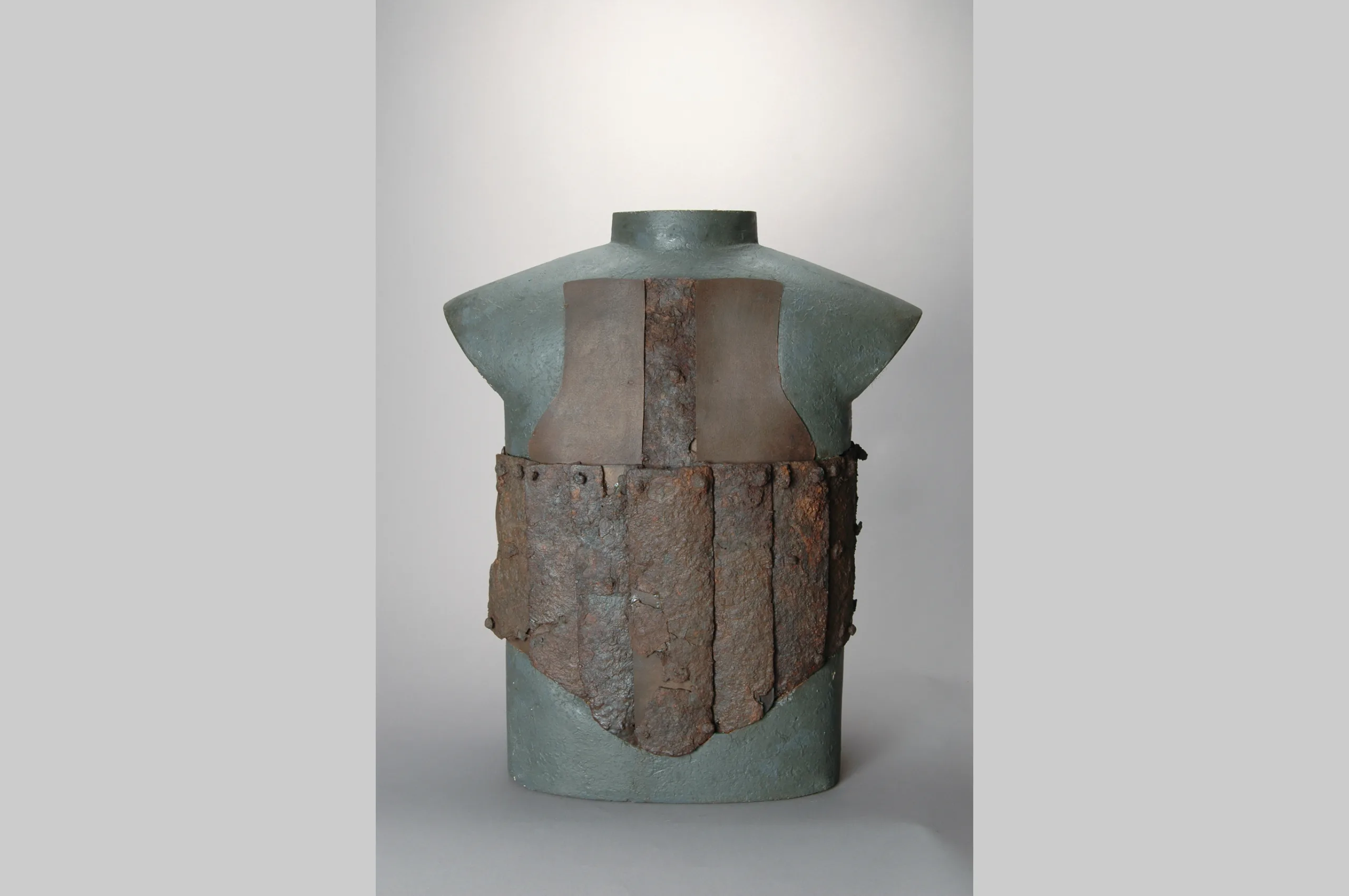 Från massgravarna, Korsbetningen, Visby socken, Gotland, 1250-1361 e. Kr. Det här harnesket grävdes upp 1924, utan dokumentation, i samband med nedläggningen av ett vattenrör. Den rekonstruerades med de andra harnesken som förebild. SHM 17530:C1, C4, V:23