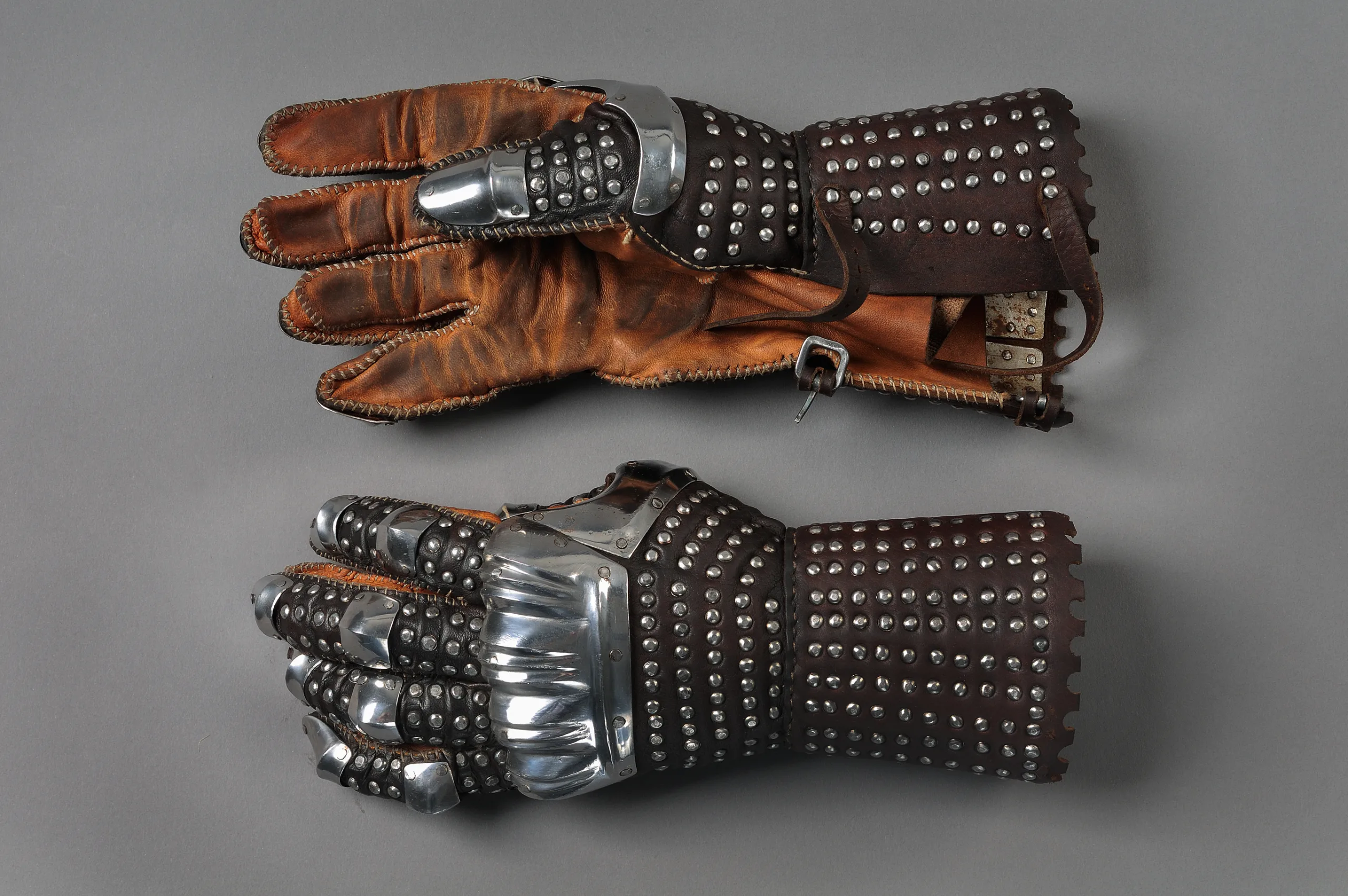 The original on which the reconstructed gloves are based can be found in the display case to the left. It is known as "Glove 4”. It was excavated in 1912, but the placement of the different parts was not documented. Other gauntlets that have been found have helped in the reconstruction.