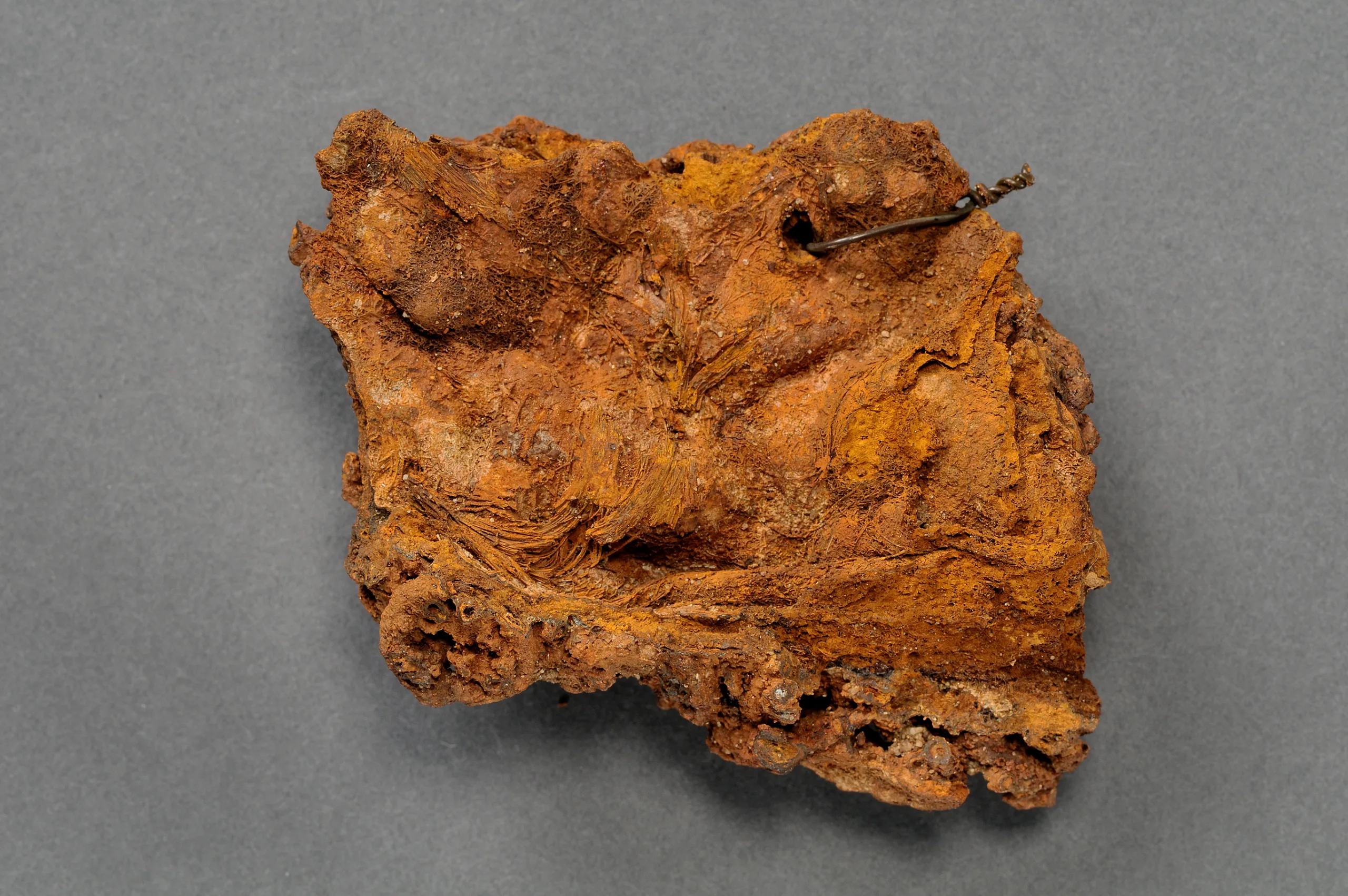 Från massgravarna, Korsbetningen, Visby socken, Gotland, 1250-1361 e. Kr. Huvan har rester av textil och hår. SHM 17530:A11:880