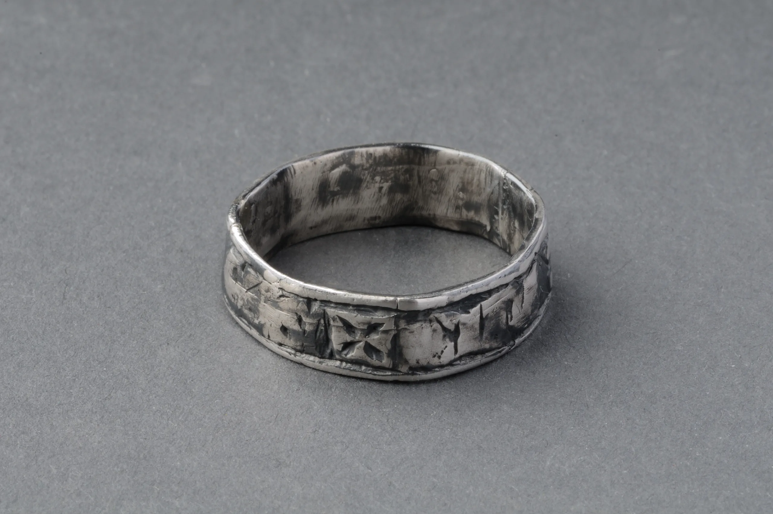 Efter original från massgravarna, Korsbetningen, Visby socken, Gotland (SHM 29750). Det enda smycke som med säkerhet kan knytas till en av de stupade. Originalet satt fortfarande på ett finger på en av de begravda individerna. På ringen finns inskriptionen "IOHANNES". Personnamn på medeltida fingerringar är relativt ovanligt. Kanske hette personen som bar ringen Johannes. Eller så syftar namnet på aposteln Johannes, en av Jesus lärjungar som var skyddspatron för många hantverkare. Det skulle också kunna vara Johannes Döparen, som i kristen tro förknippas med dopet, kristnandet och syndaförlåtelsen.