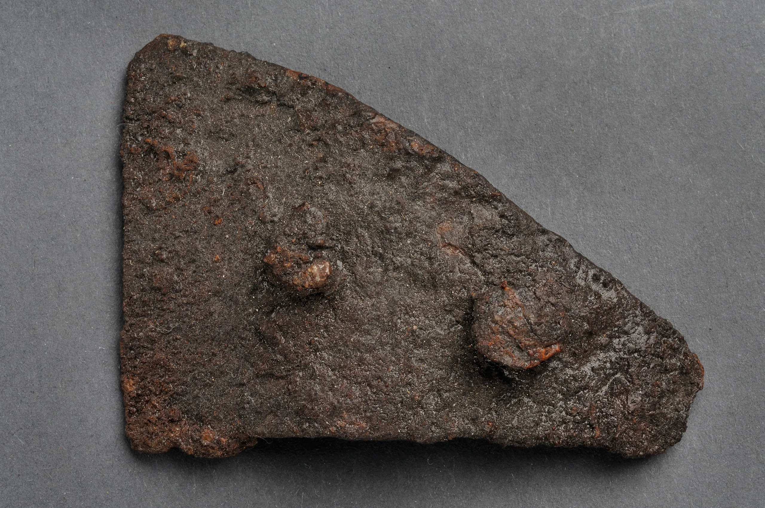 Från massgravarna, Korsbetningen, Visby socken, Gotland, 1250-1361 e. Kr. Del av rustningssko. Plåtarna har suttit på insidan av, troligtvis, läder. Skorna bör ha sett ut ungefär som den danske prinsen Kristoffers skor. SHM 19525:Pss10:B2