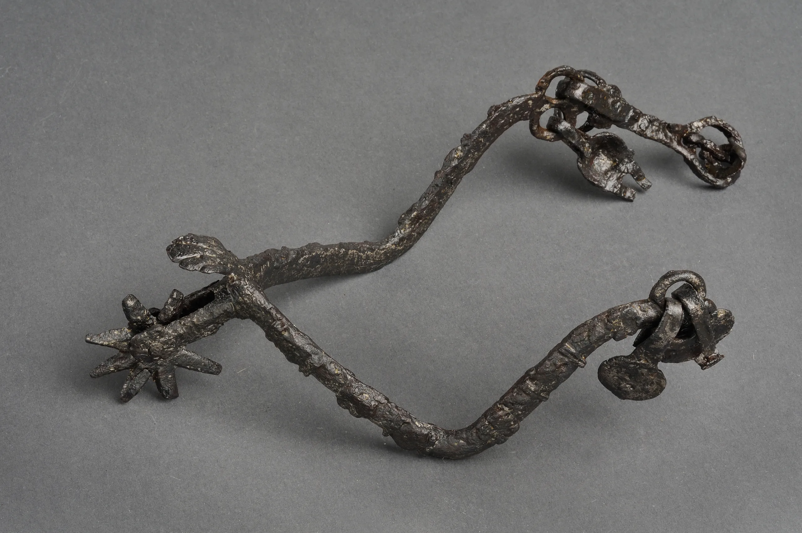 Bildtext Sporre, järn Från massgravarna, Korsbetningen, Visby socken, Gotland , 1250-1361 e. Kr. Välbevarad sporre dekorerad med små blommor. Notera de små delarna för att hålla remmarna, såsom en liten "öljett". SHM 19325:Lå1