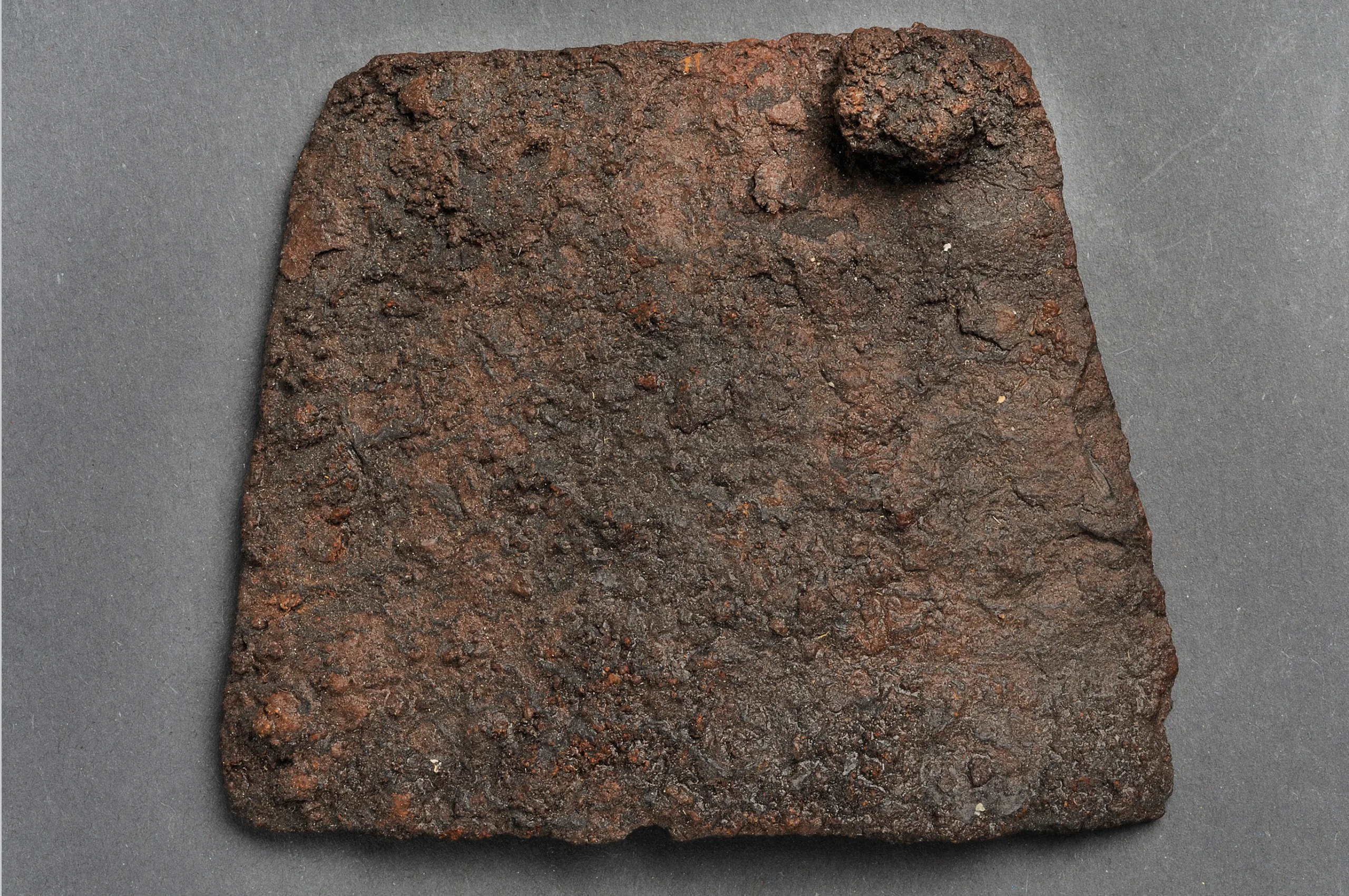 From the mass graves, the Cross Meadow, Visby parish, Gotland, 1250-1361 A.D. Part of an armoured shoe. The plates have been placed on the inside of, probably, leather. The shoes probably looked similar to the Danish prince Christopher's shoes. SHM 19525:Pss10:B4