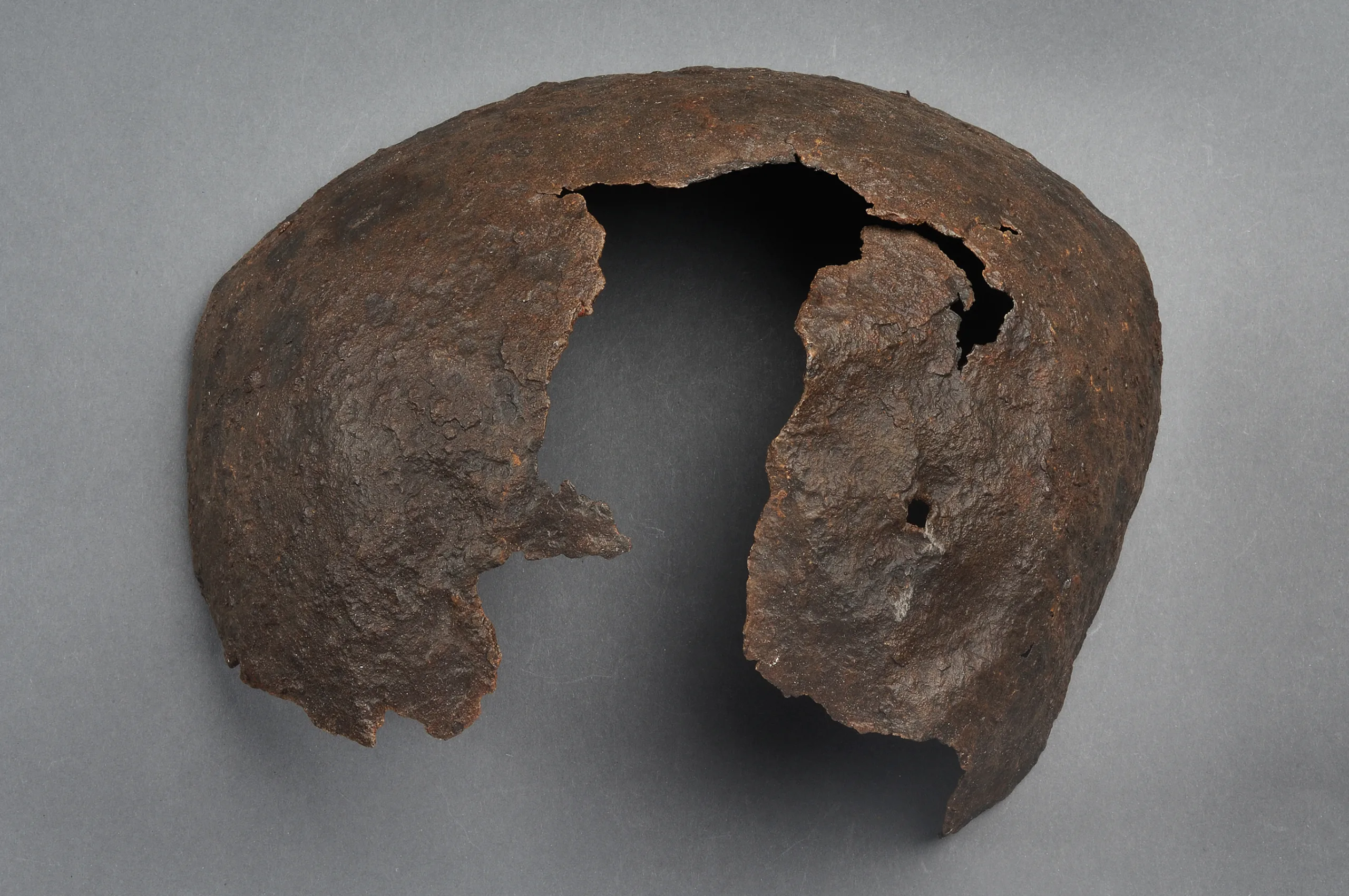 Caption Helmet, iron From Ragnhildsholmen, Säve parish, Bohuslän, 1250-1361 A.D. A chain-mail hood has probably been attached to the bottom of the helmet. The cathedral in Verden has a wooden sculpture depicting a similar helmet. SHM 7040:494