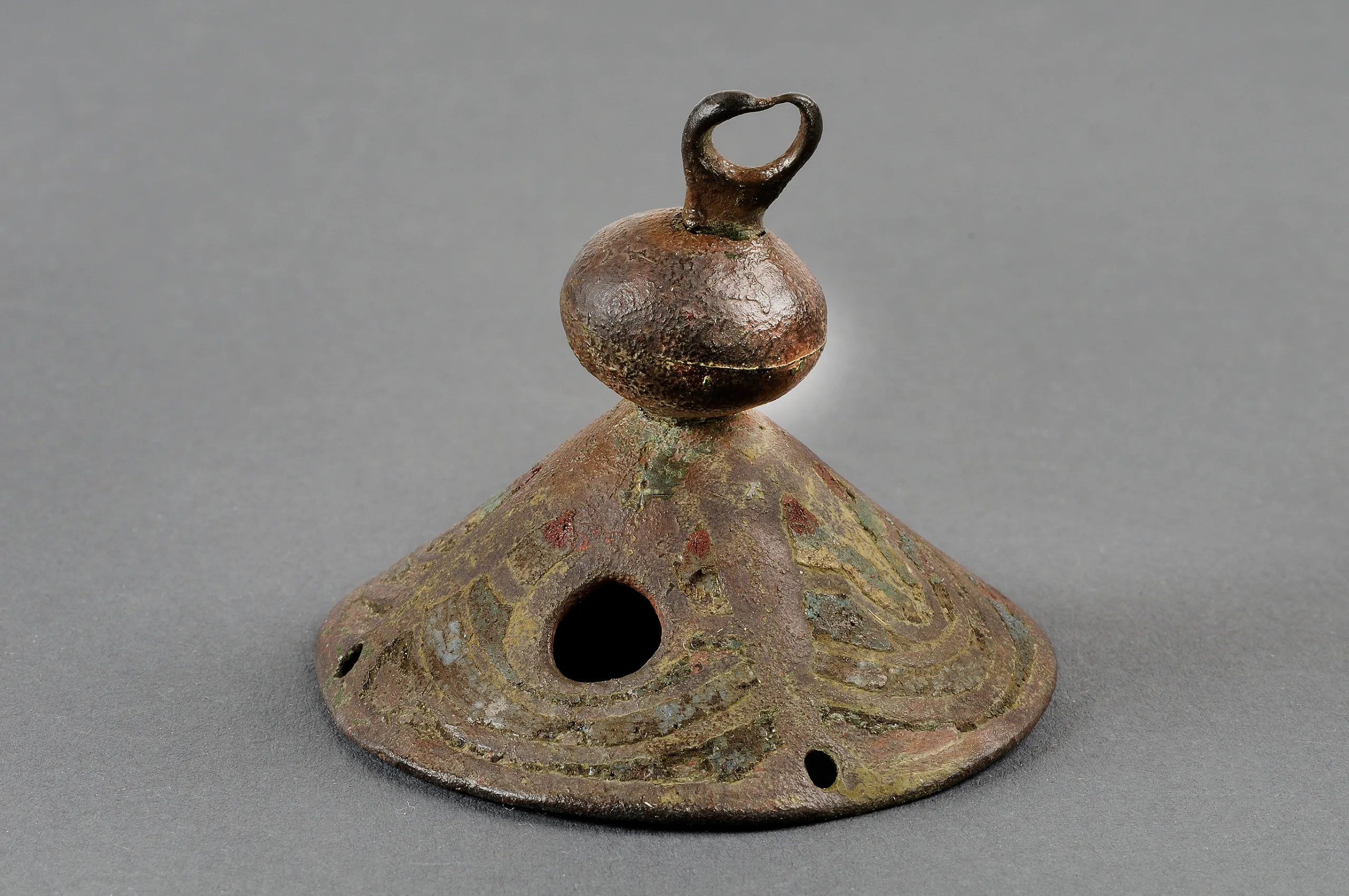 From Stora Hellvigs, Fole parish, Gotland, 1250-1361 A. D. The lid of a censer was also found close to the farm. A censer is a vessel in which incense is burned, it is used in catholic church services. The vessel often consist of a bowl shaped bottom part and a lid hanging from chains. This particular lid is cone shaped, crowned by a ball with a fixed carrying loop at the top. The cone has an ornate design including a star and palmettes, a stylised palm leaf in enamel. The enamel is badly damaged, perhaps by fire. Could it be that Fole Church nearby was also pillaged by the Danish soldiers and that the censer lid was dropped for some reason? SHM 21993:5