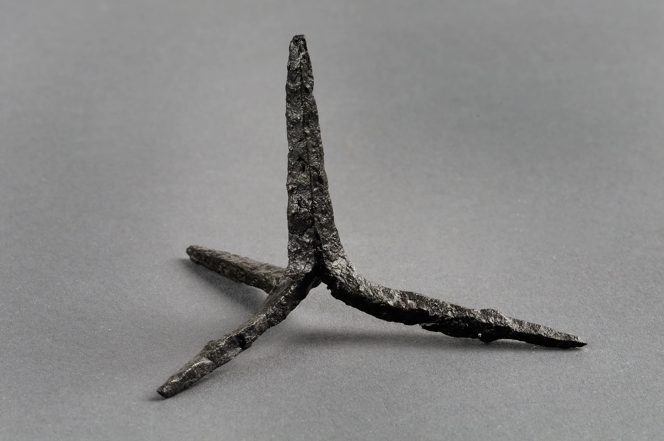 From Stora Hellvigs, Fole parish, Gotland, 1300-1361 A. D. A caltrop is a type of weapon. It consists of four sharp ends that are designed in such a way that one end is always pointing upwards regardless of its position. By spreading many caltrops on the ground it will make it difficult for the enemy to advance, regardless of whether they are on horseback or foot. A caltrop looks about the same today as it did then and is sometimes used in robberies to make it difficult for pursuing cars. SHM 21993:117