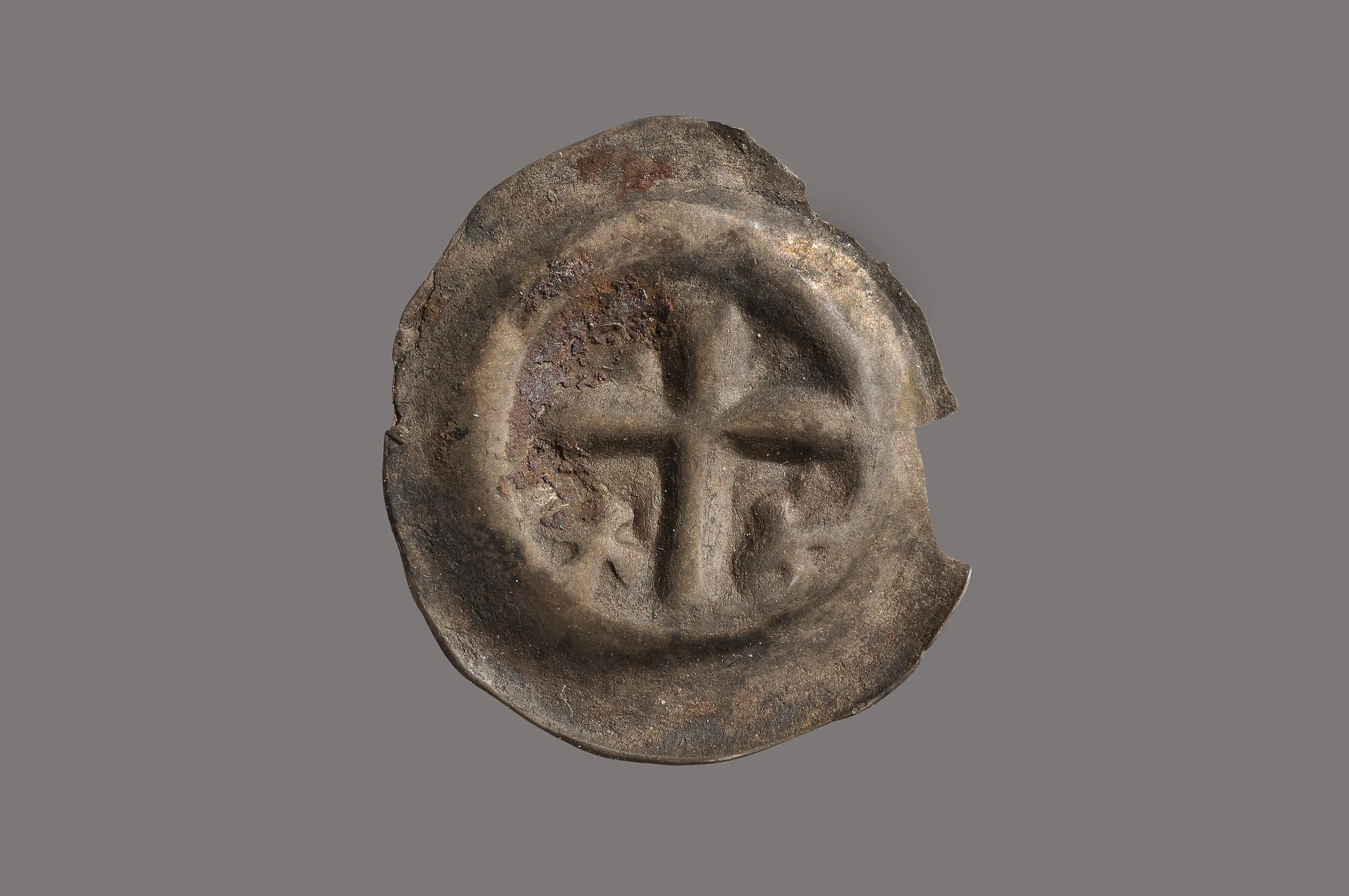 From the mass graves, the Cross Meadow, Visby parish, Gotland. A single-sided coin, "bracteate". A cross embraced by a circle. On both sides of the base of the cross there are two smaller crosses. At the upper side of each cross arm two beams spring out. SHM 19325:Mz3