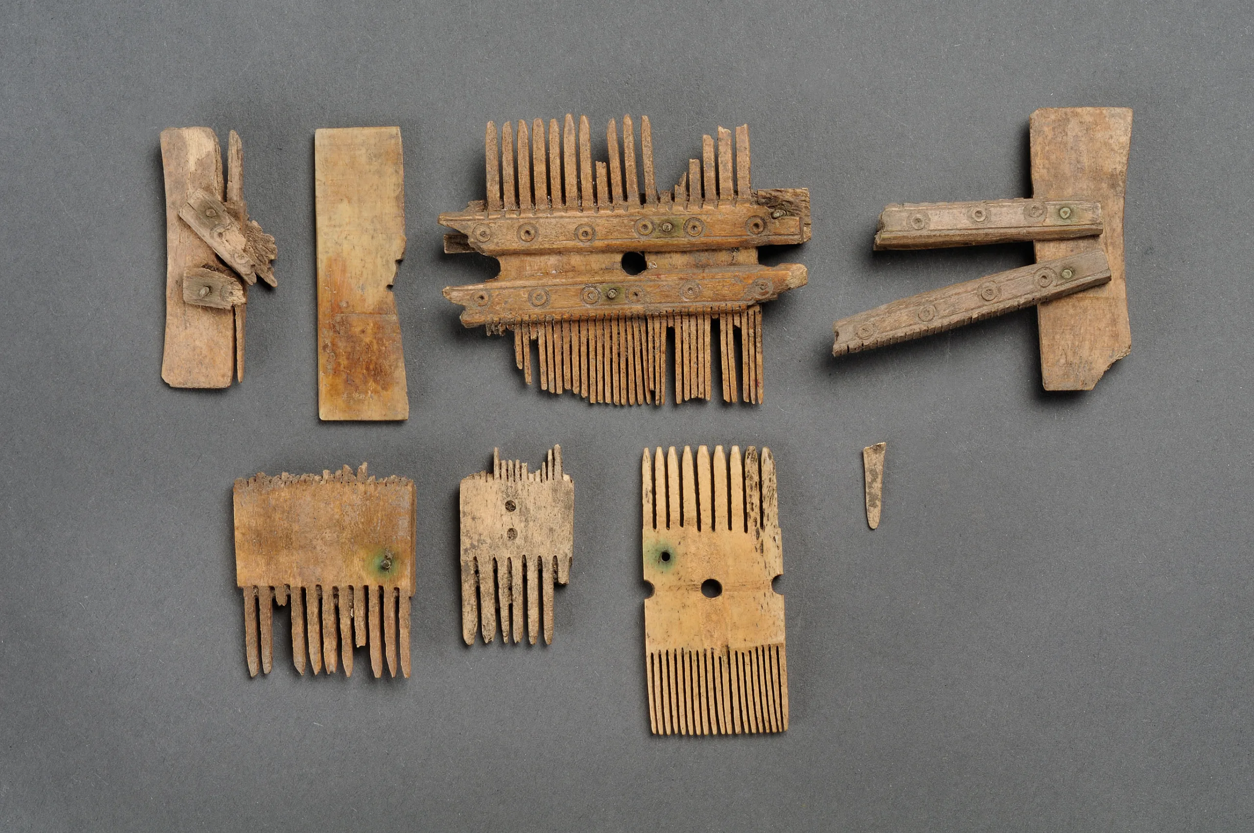 Från Stora Hellvigs, Fole socken, Gotland, 1300-1361 e. Kr. Två av delarna finns i montern. Kammar var del av den personliga utrustningen. Kammen består av tandade skivor fastnitade på skenor, dessa var ofta ornerade. På 1300-talet var det vanligt med dubbelkammar, där den ena tandradens tänder var grova och den andra sidan betydligt finare, likt dagens luskam. SHM 21993:10-17