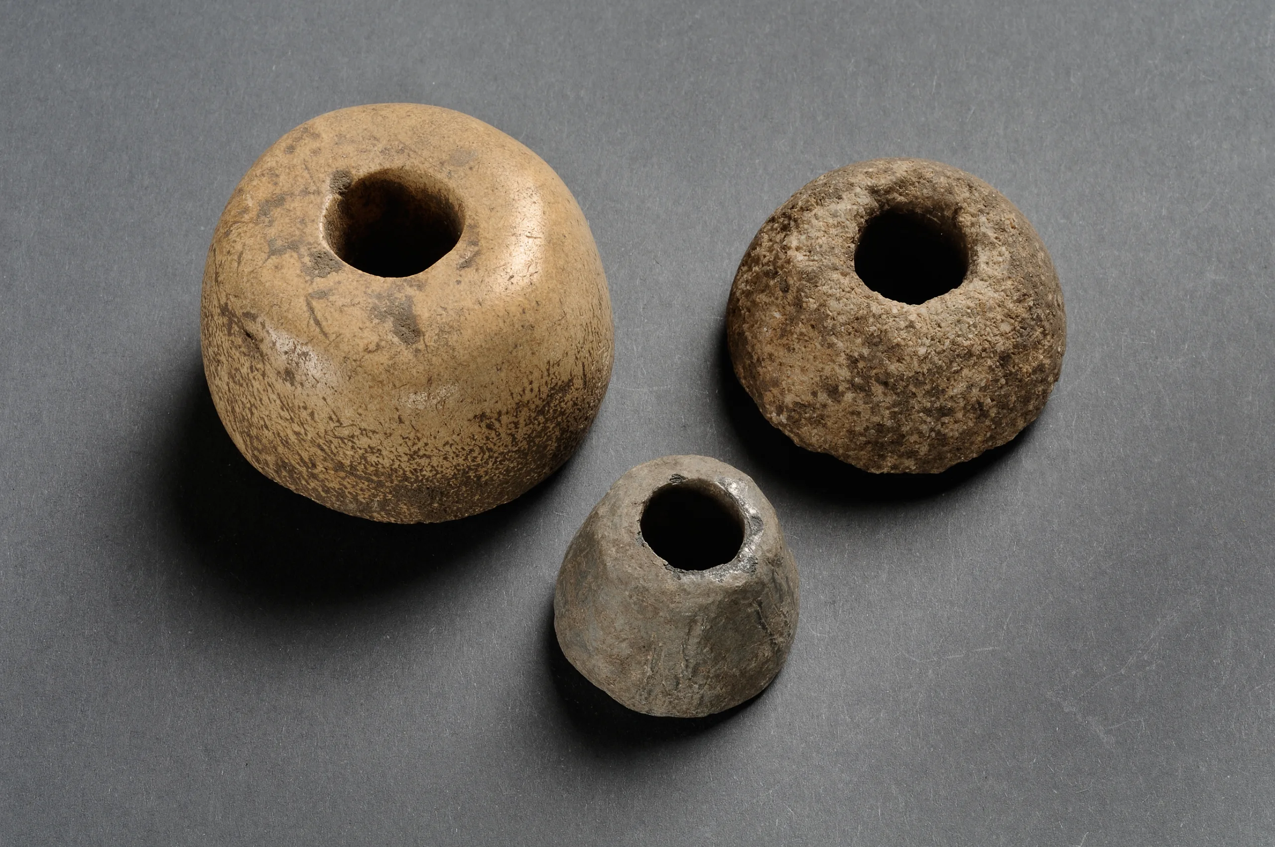 From Stora Hellvigs, Fole socken, Gotland, 1300-1361 A. D. A spindle consists of two parts; a stick, the rod, and a weight attached to it, the whorl. With the weight of the whorl as a stabiliser, the spindle can rotate around its own axis and the spinning material can be spun to yarn. Two of the spindle whorls are in the showcase. SHM 21993:7-9