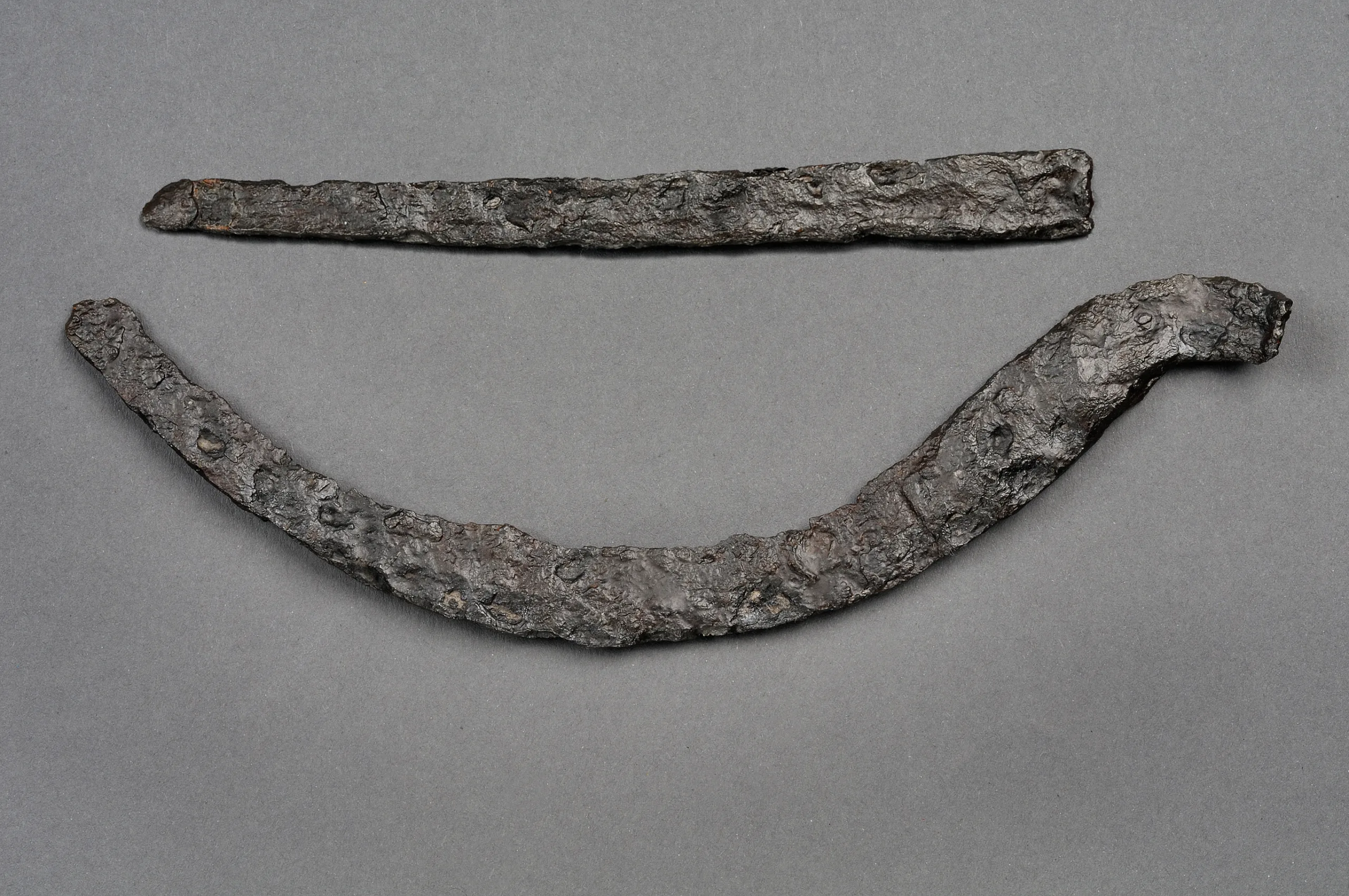 From Stora Hellvigs, Fole parish, Gotland, 1300-1361 A. D. Bow-sickle blade made of iron. A hand tool used when harvesting hay. In the early Middle Ages, cereal crops were cut high, near the ear. Later in the Middle Ages, there was a gradual transition to cutting the grain further down. SHM 21993:105B, 21993:105A