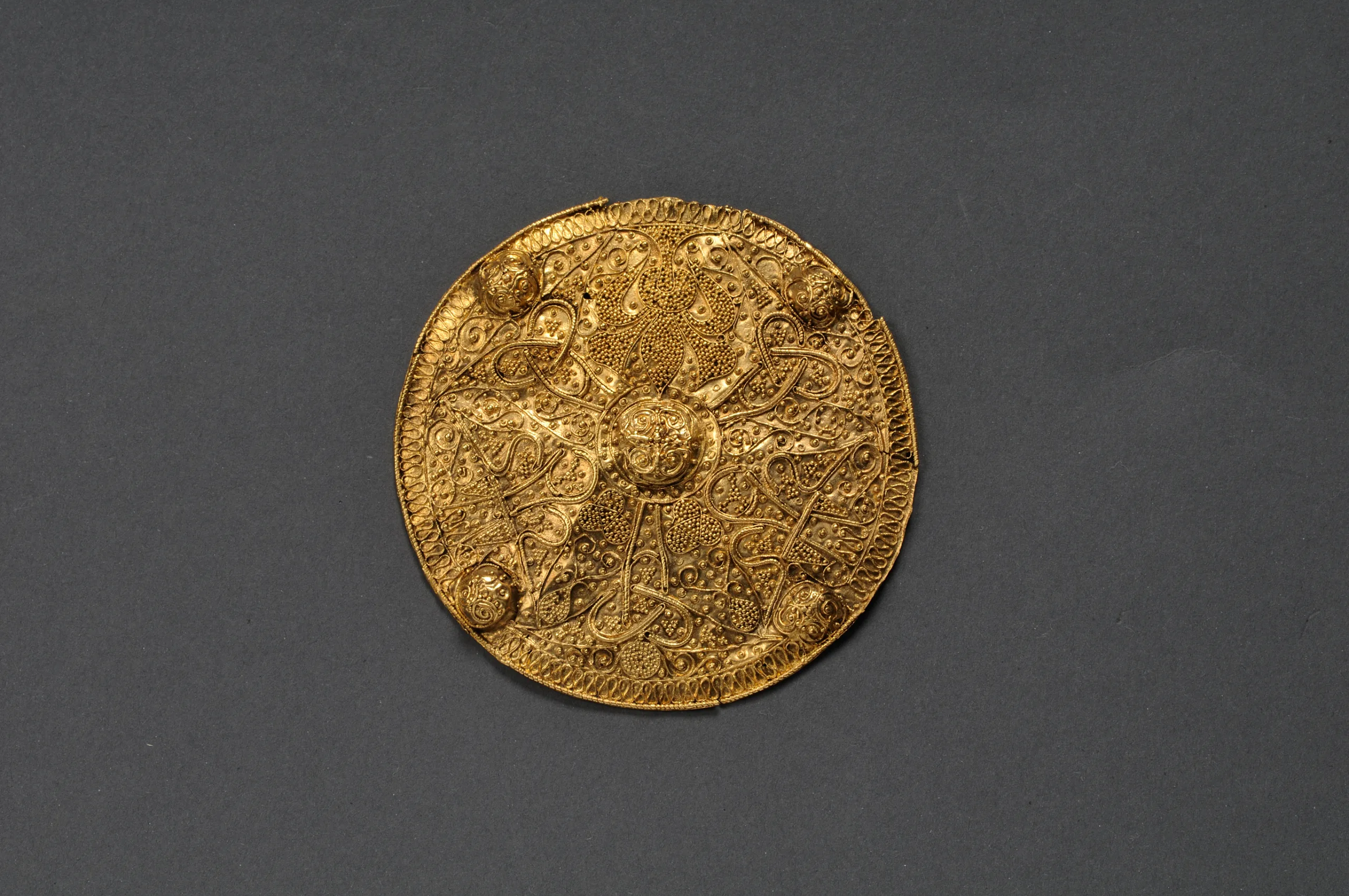 Från Ammunde, Burs socken, Gotland, 1100-1361 e. Kr. Brakteat av guld. De två brakteaterna i montern är inte identiska, men snarlika. De består av en rund, något kupig skiva med mittbuckla och fyra kantbucklor. De är dekorerade med filigrantråd (en fint bearbetad tråd som löds fast på underlaget) och granulater (små korn som löds fast på underlaget). Filigrantråden bildar mönster som sedan förstärks genom utplaceringen av granulater. Mest framträdande är de heraldiska liljorna i anslutning till hängets bärögla. Liljan symboliserar renhet och jungfrulighet; av tradition representerar den jungfru Maria, och dess tre blad anger treenigheten eller dygderna visdom, trohet och självuppoffring. Som maktsymbol förekommer den bland annat i spetsen på härskares spiror och som ornament i kungakronor. SHM 2485:1: B