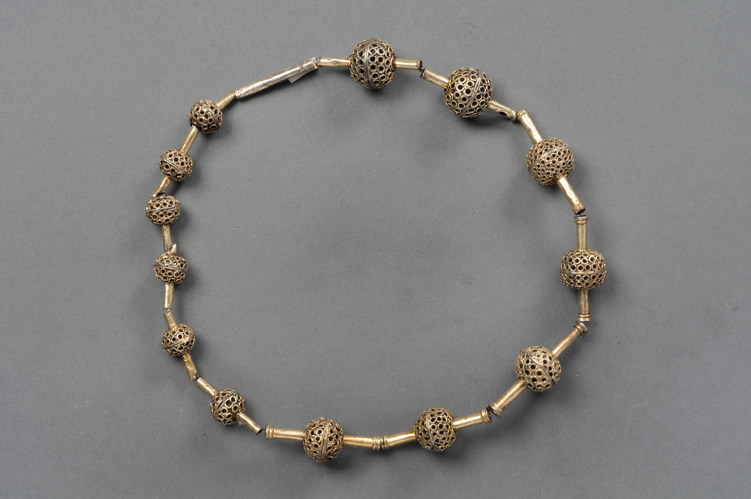 Från Ammunde, Burs socken, Gotland, 1250-1361 e. Kr. Halssmycke av silver bestående av rör och kulor av olika storlekar som trätts upp på tråd. Kulorna är genombrutna och ornerade med rader av små ringar. SHM 2485:28