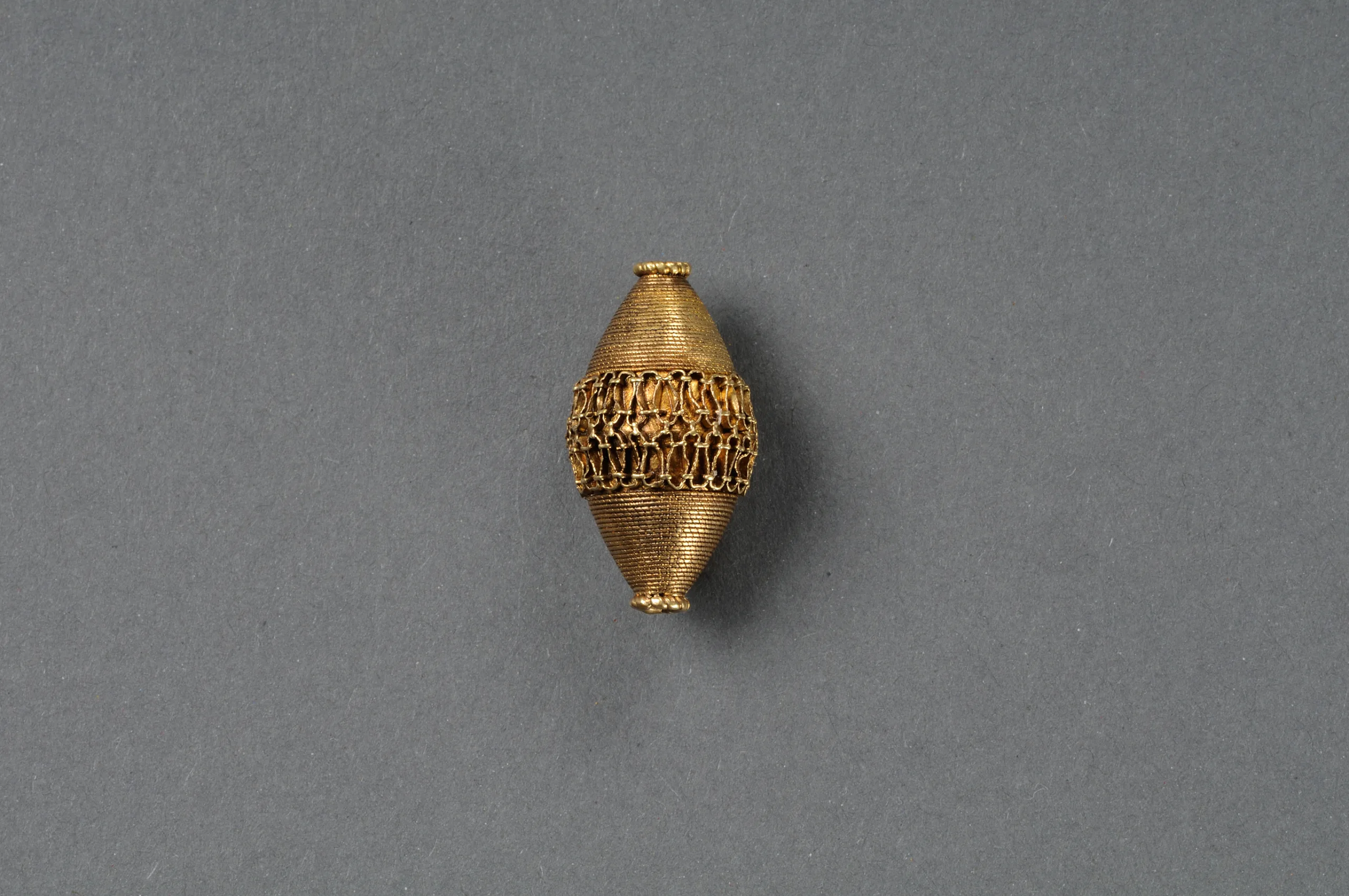 From Ammunde, Burs parish, Gotland, 1000s A.D. Spool-shaped pearl made of gold, decorated with filigree (a finely worked thread that is soldered to the substrate). This particular type of pearl occurred as early as in the Viking Age. SHM 2485:2
