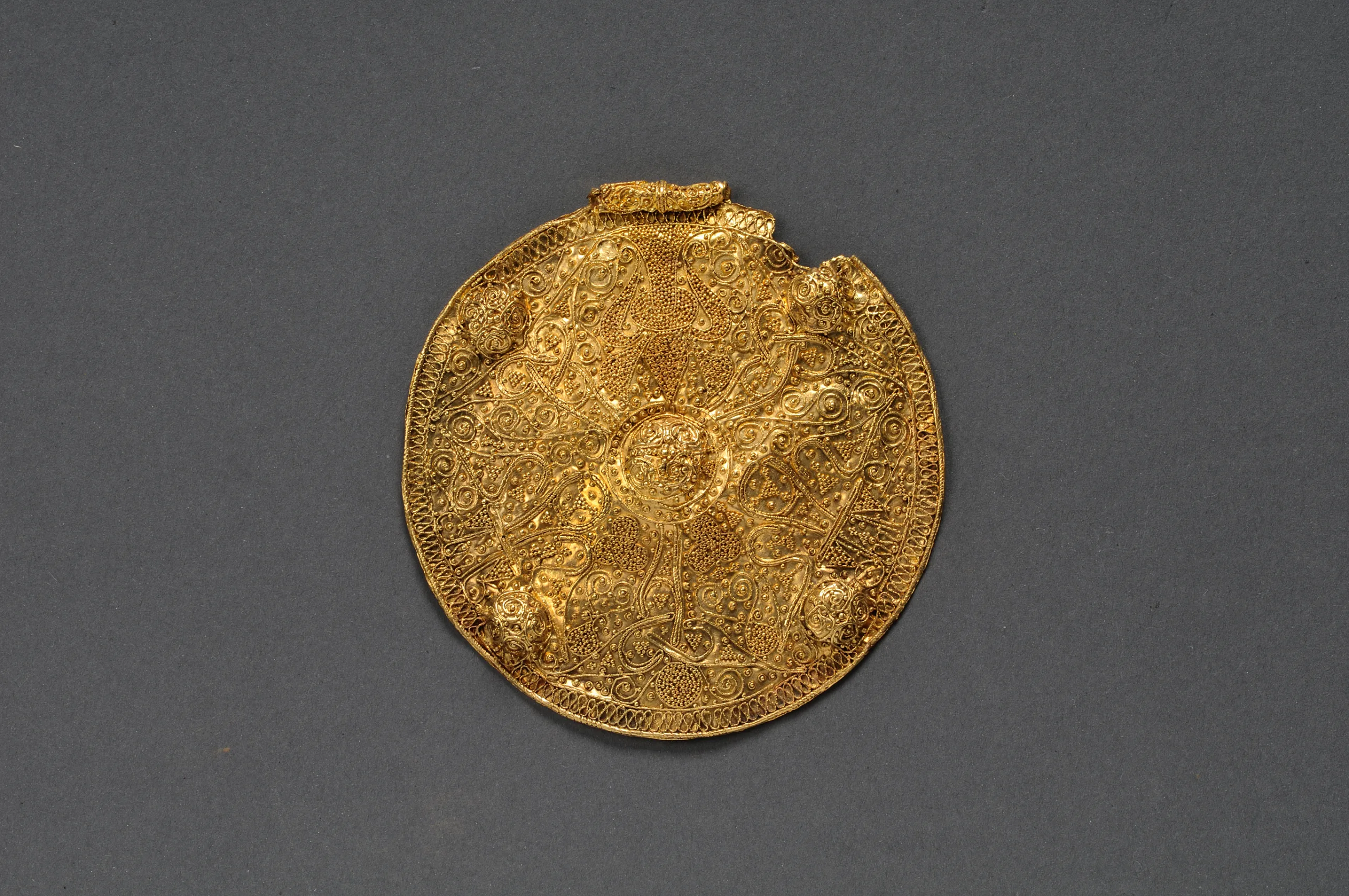 From Ammunde, Burs parish, Gotland, 1100-1361 A.D. Bracteates made of gold The two bracteates are not identical, but are similar. They consist of a round, somewhat convex plate with a centre boss and four edge bosses. They are decorated with filigree (a finely worked thread that is soldered to the substrate) and granules (small grains that are soldered to the substrate). The filigree forms patterns that are amplified by the display of granules. The most prominent are the fleurs-de-lis adjoining the carrying loop of the pendant. The fleur-de-lis symbolises purity and virginity; by tradition it represents Virgin Mary and the three leaves signifies the trinity or the virtues of wisdom, loyalty and self-sacrifice. As a power symbol it occurs in places such as at the top of sceptres and as ornaments in royal crowns. SHM 2485:1:A