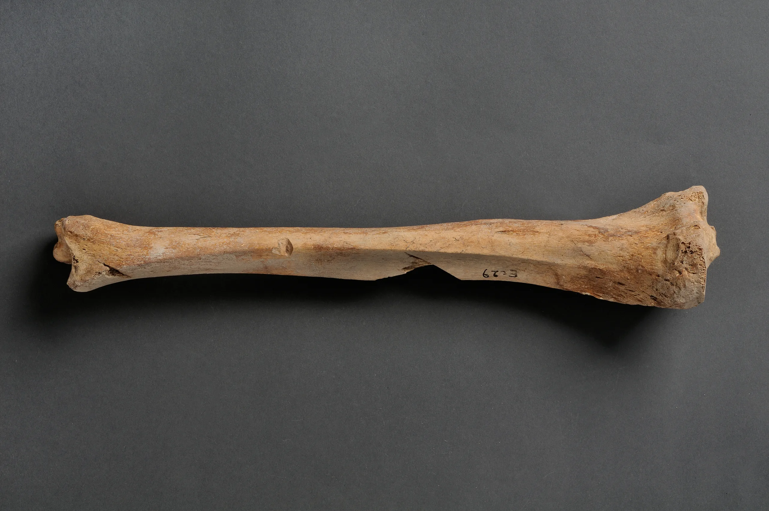 Bildtext C: Skenben Höger ben, från en vuxen individ. Benet har träffats av ett kraftigt hugg mitt på framsidan, ett stort benstycke har lossnat. Ett mindre hugg syns på utsidan av benet.