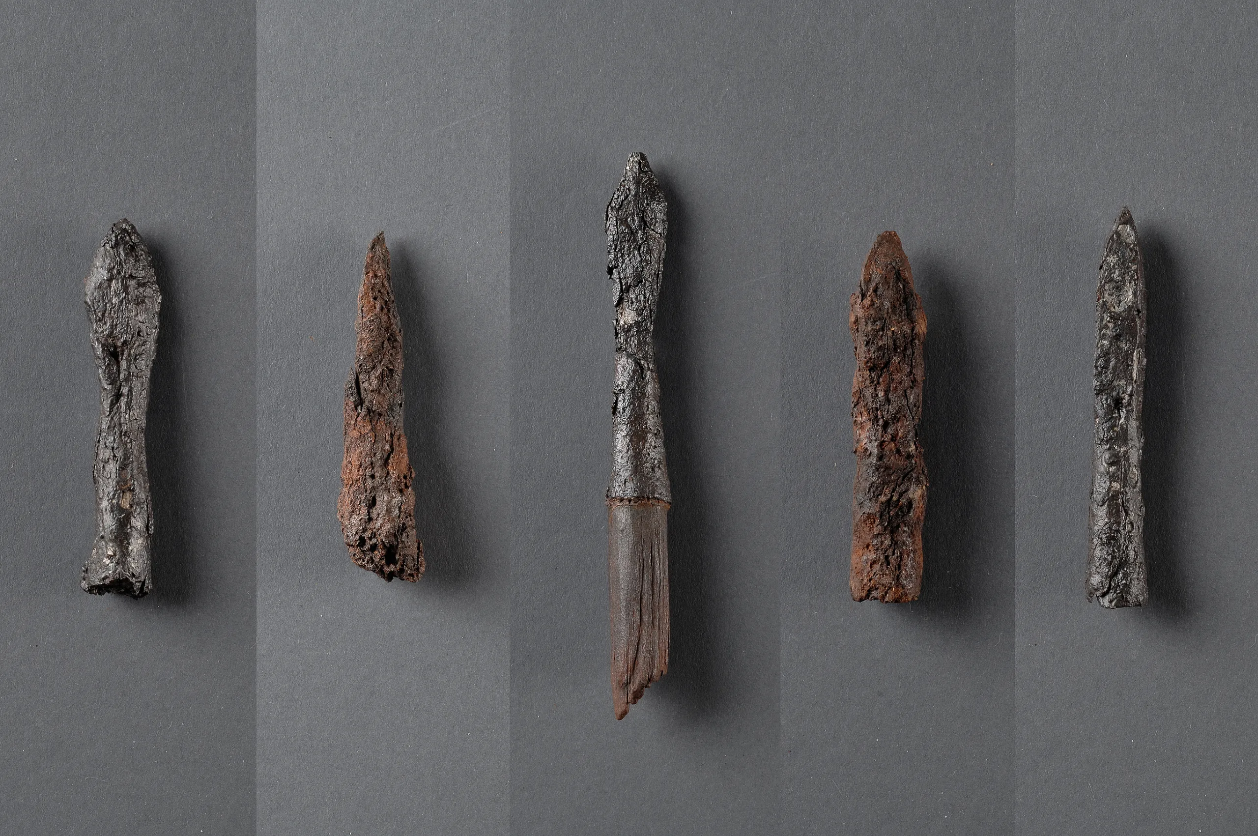 Från massgravarna, Korsbetningen, Visby socken, Gotland, 1250-1361 e. Kr. Totalt 38 pilspetsar hittades i massgravarna, varav flera fortfarande satt kvar i kropparna. Det här är några av dem. En av pilspetsarna har fortfarande en bit av träskaftet kvar. SHM 19525:Ntt15, 17530:A32:310, 19525:Pvv10, 19525:VI:51, 19525:Nrr13