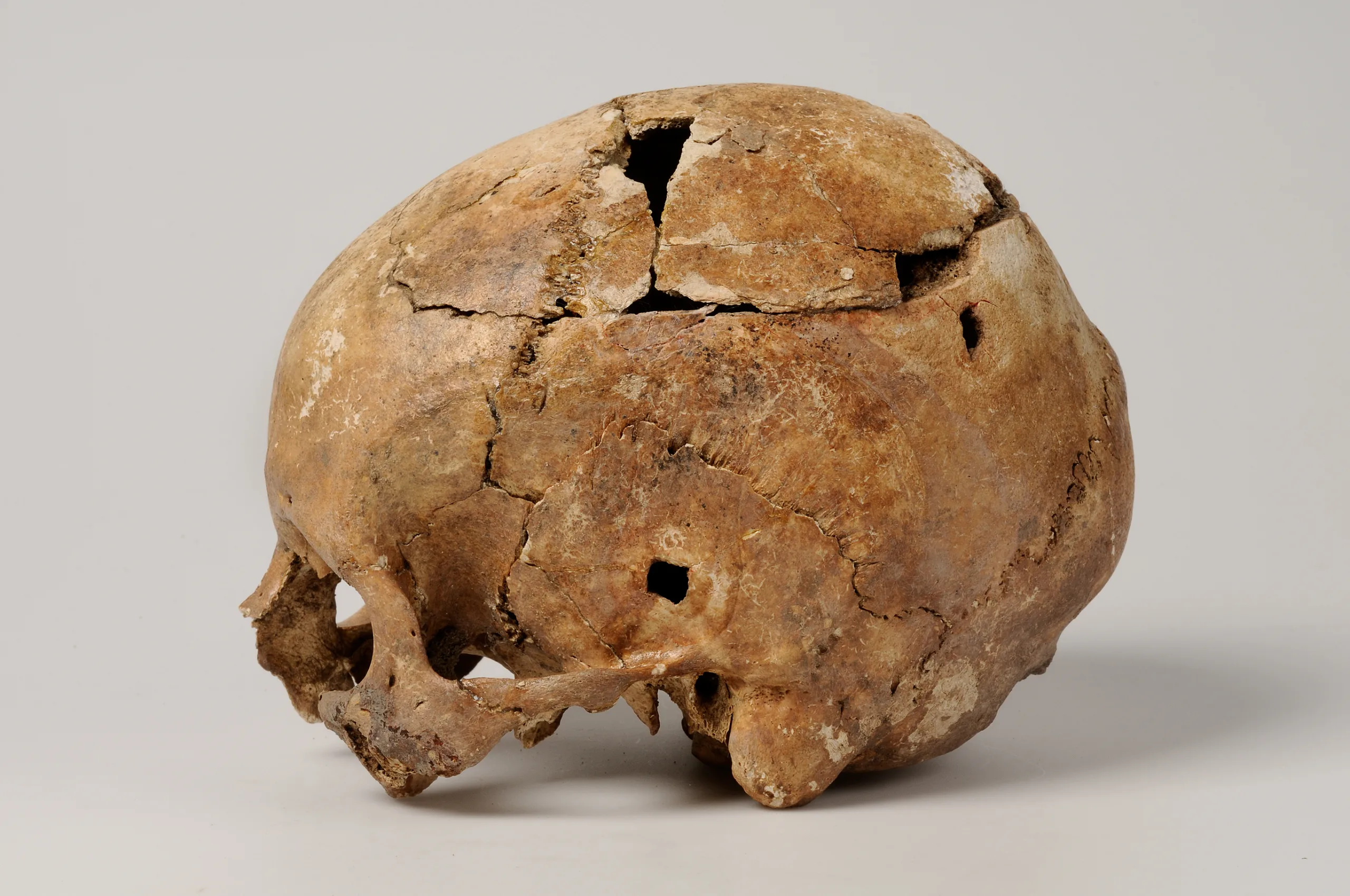 At the left side of the skull as well as the back of the head you can see traces of at least four severe sword or axe stabs as well as three square holes that have penetrated the skull bone, probably caused by blows from a bec de corbin. There is a smaller hole wound on the left temple. SHM 19325