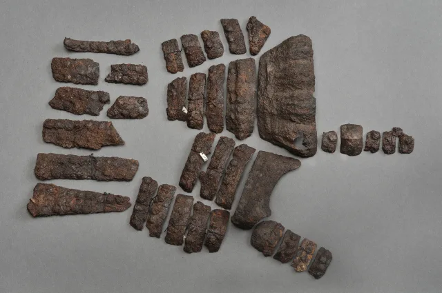 Del av ringbrynjehuva, järn Wisbyharnesk, järn Pansarhandske, järn Pansarhandske, järn Pansarhandskar, rekonstruktion Harnesk, rekonstruktion Ringbrynjeskjorta, kjortel, rekonstruktioner Ringbrynjehuva, rekonstruktion